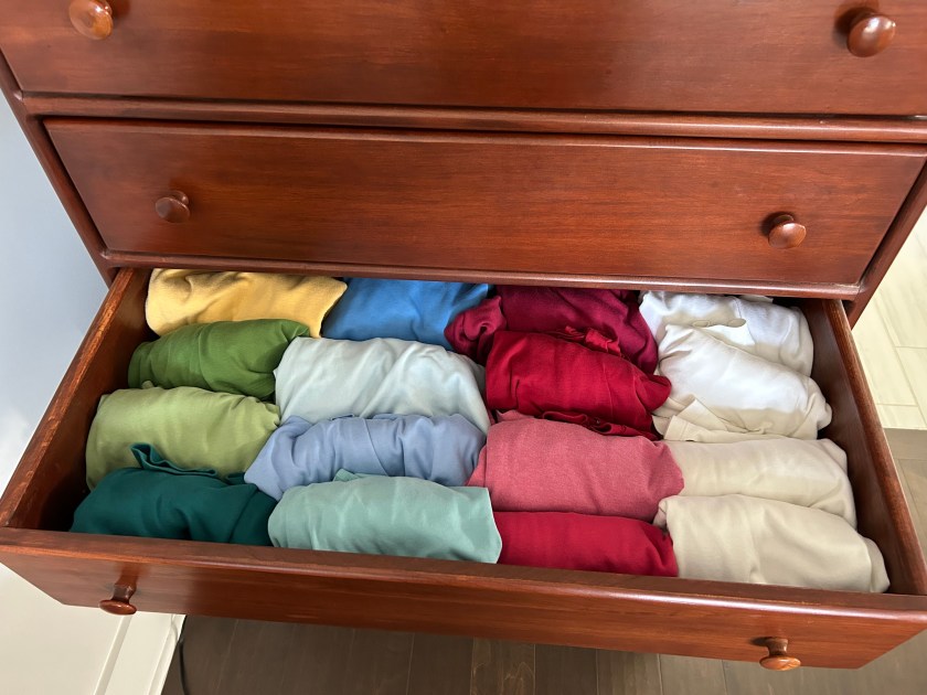 And I’m liking the result a lot. I can see what I have without pawing through stacks, and the shirts do not wrinkle as they do when folded flat, especially when they sit for several seasons to pass.