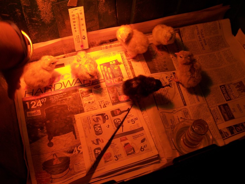Rose called today.  The eggs we’ve been incubating at her house are hatching!!  We have three out already.  We expected them tomorrow.   These are Marans, Wheaten Americaunas, Maran-Wheaten crosses (which will lay an olive colored egg), some guineas, and I’m not sure what else.  Rose said one of the crosses is black!!