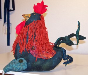 Carol Boyer visited Coastal Quilters, and did a workshop on Friday, May 14th before our Saturday meeting.   Carol is one of the most creative people I have ever met, and spending time with her is so freeing.  Carol taught art in the public schools, and she is willing and able to try anything to see how it might work.  She is an inventive quilter, but she also makes dolls.  Our workshop was to make a “funky chicken.”  And, she had prepared a hen pattern for us to use.  I had it in my head that I wanted to do a rooster.  No problem.  With a few snips and inserts into the pattern, the hen got a longer neck, bigger comb, and so forth.  A rooster tail?  No problem.  Go home and get some wire…  Here’s what came home with me.