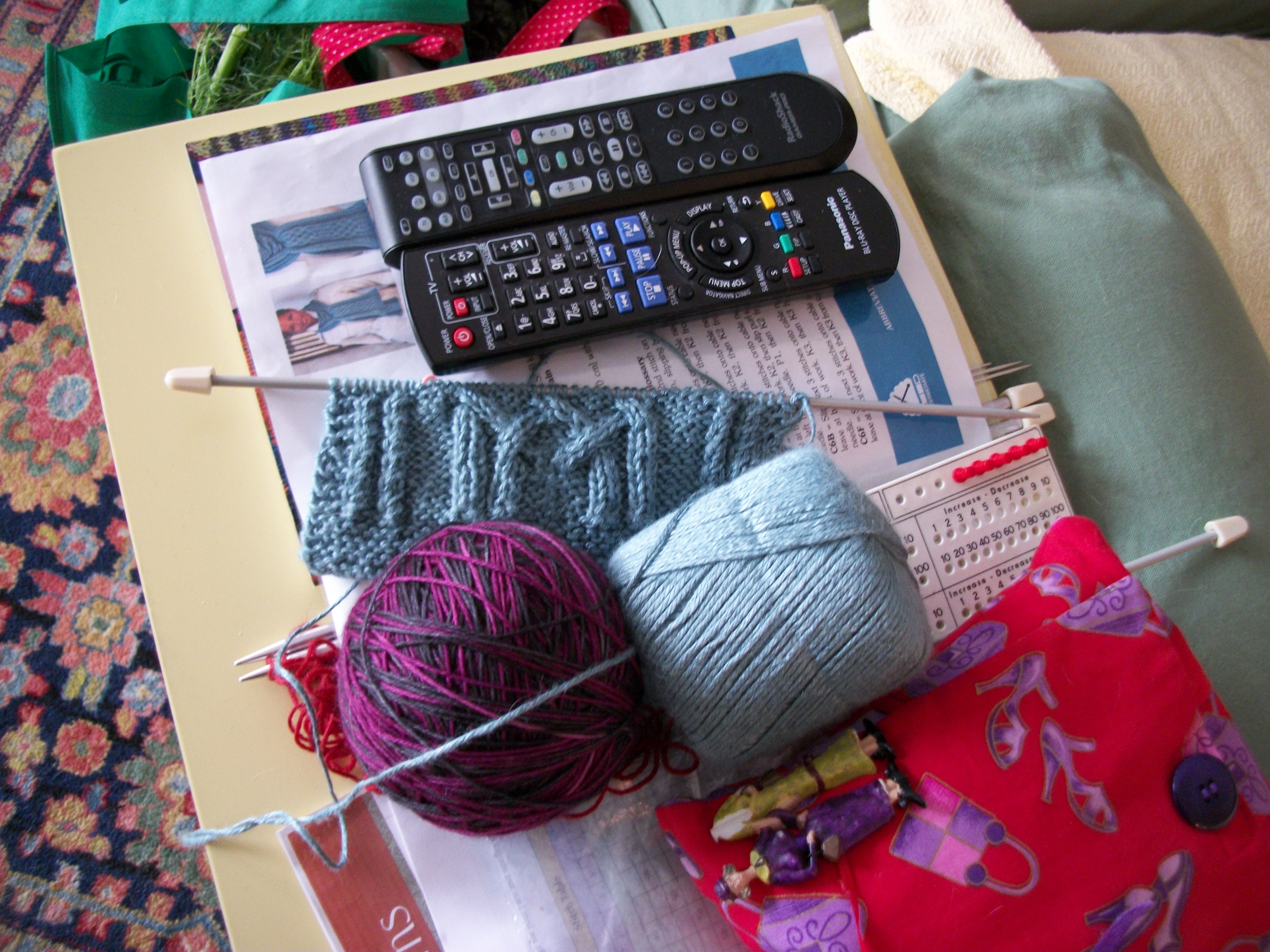 I can hardly wait to start this sweater. But, but, I have two other projects ahead of this one. A silk/bamboo scarf–so I can master cables and an intricate pattern. (I’ve already taken it out twice, but I’m getting the hang of it now. And, some sock yarn (magenta and dark grey) that I’m going to use to try socks that start at the toe AND that use a 5-stitch pattern.