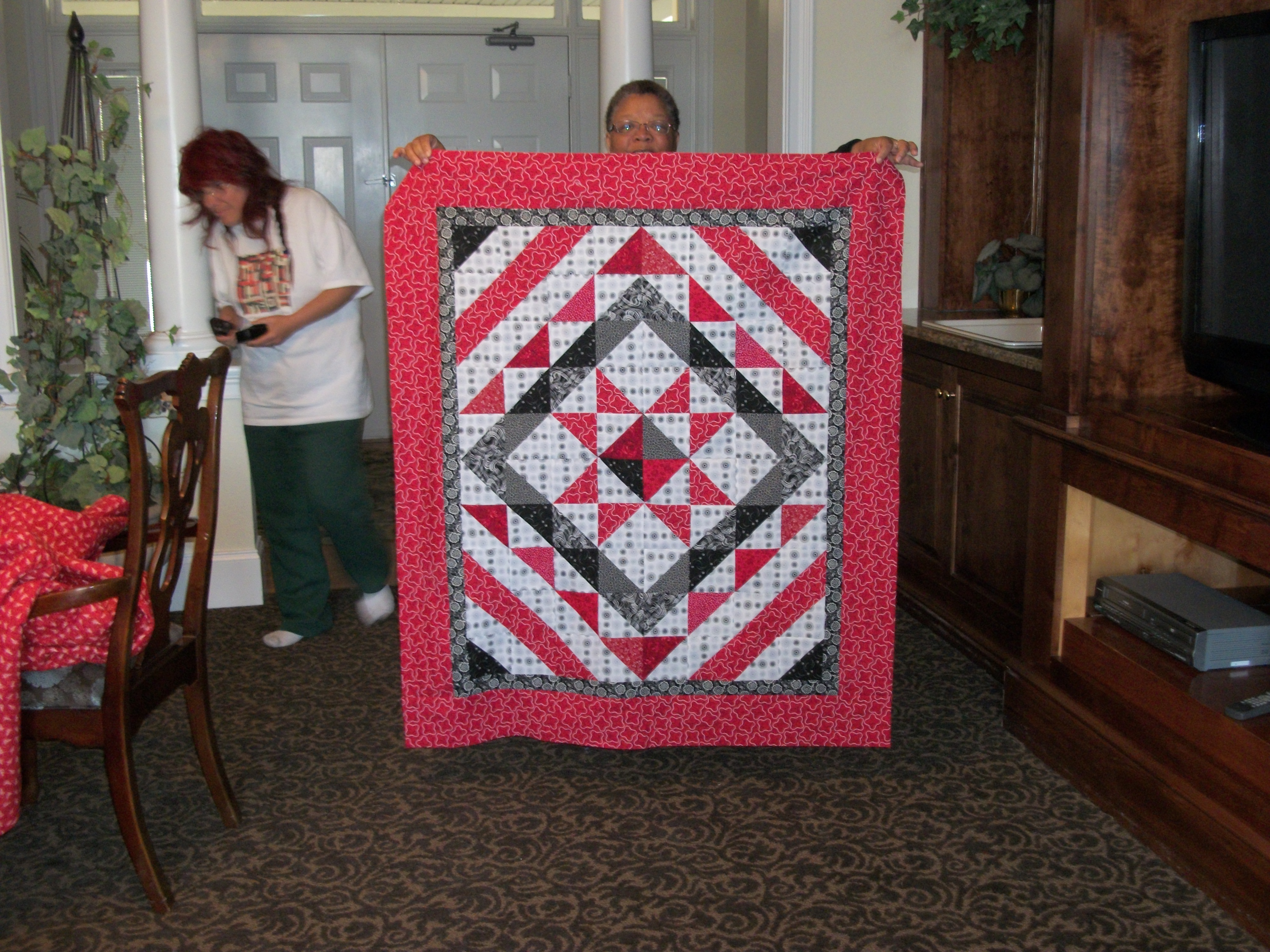And, here’s a picture of a Christmas quilt with very unusual fabric that Rose was putting the binding on. The back is a warm, red fabric.