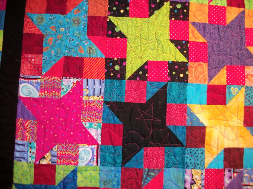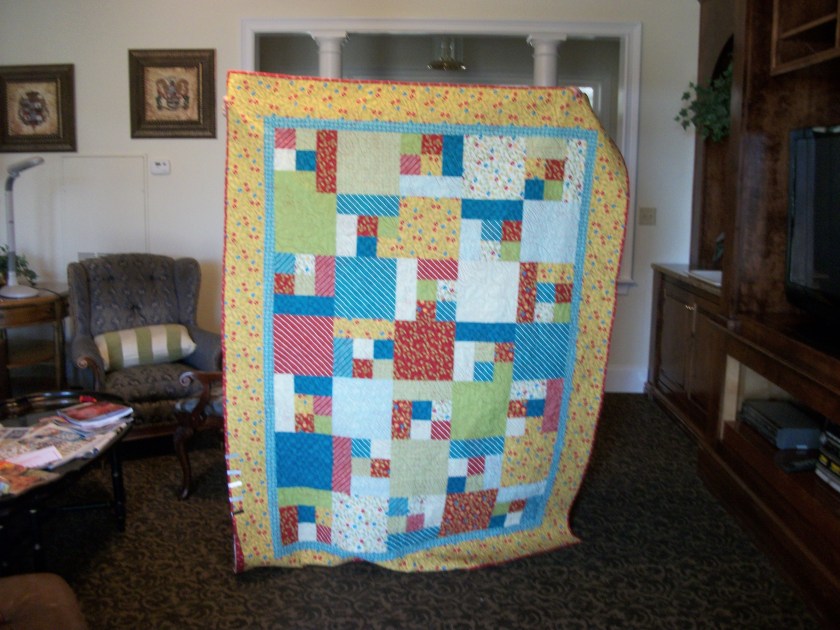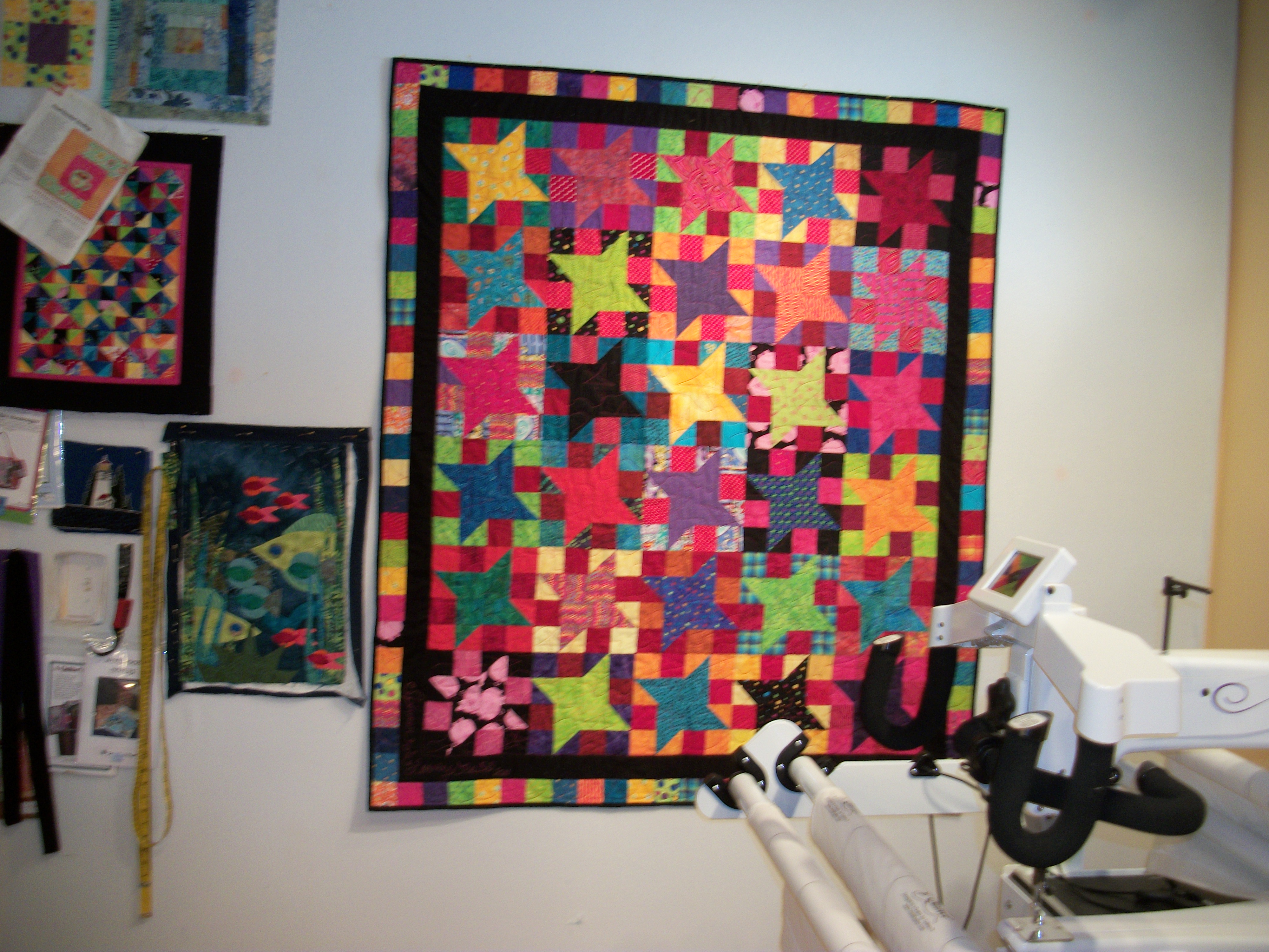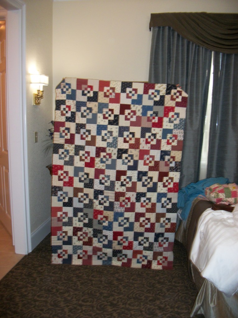 And here’s one of the quilt tops Carrie finished almost right away! She made another BIG one and a new purse. Carrie has a new long-arm too, and we watched a set of instructional videos together during the week.