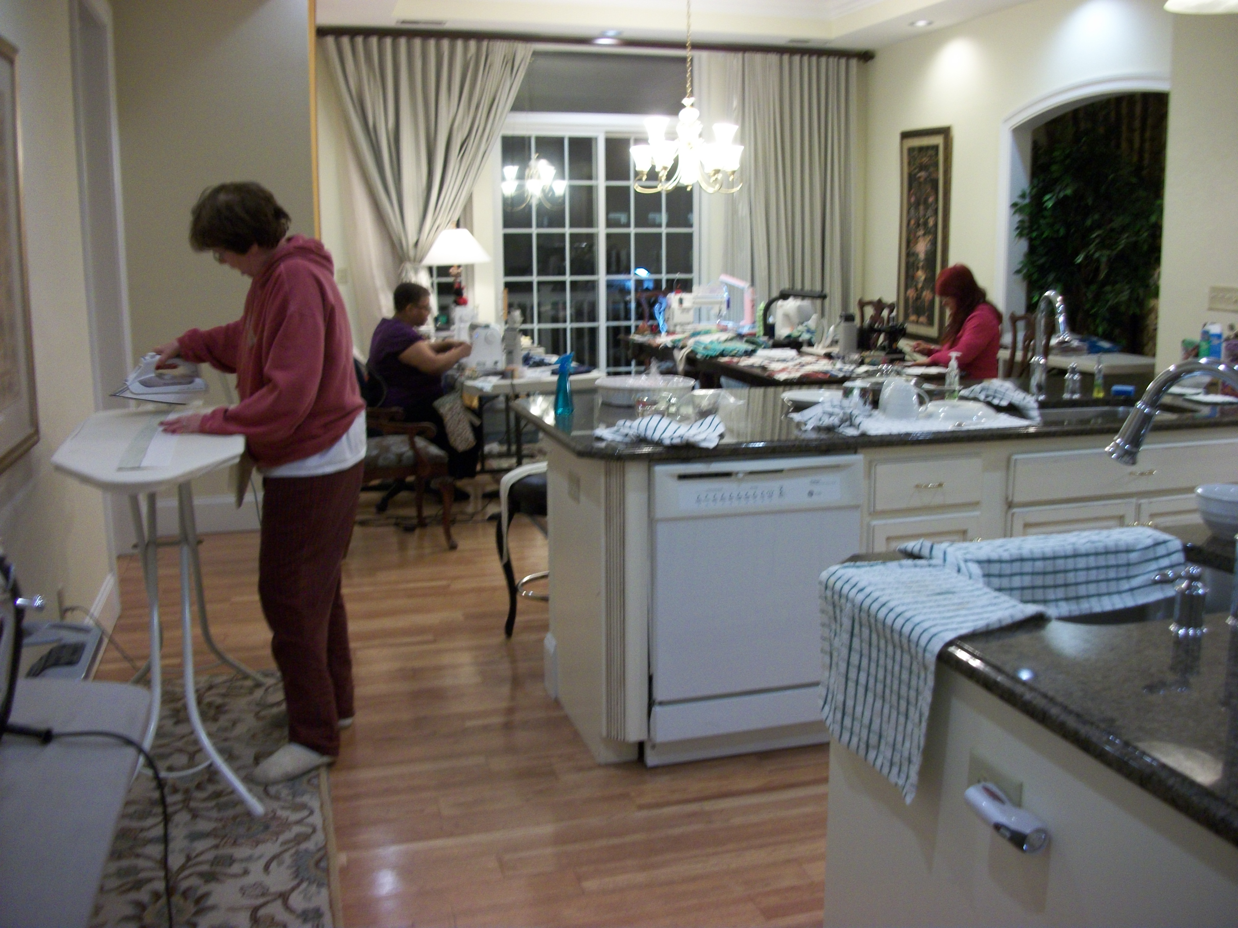 The first thing that happens is that we move around furniture so that we are all together in one room. The dining room table is good for at least 2 sewing stations. In this palatial palace, it was big enough for three. Carrie and Denise set up in the tables next to the wall. Denise brought fabrics for a large quilt that would be strip pieced. She had to cut and sew a ton of strips, cut them, and sew more.
