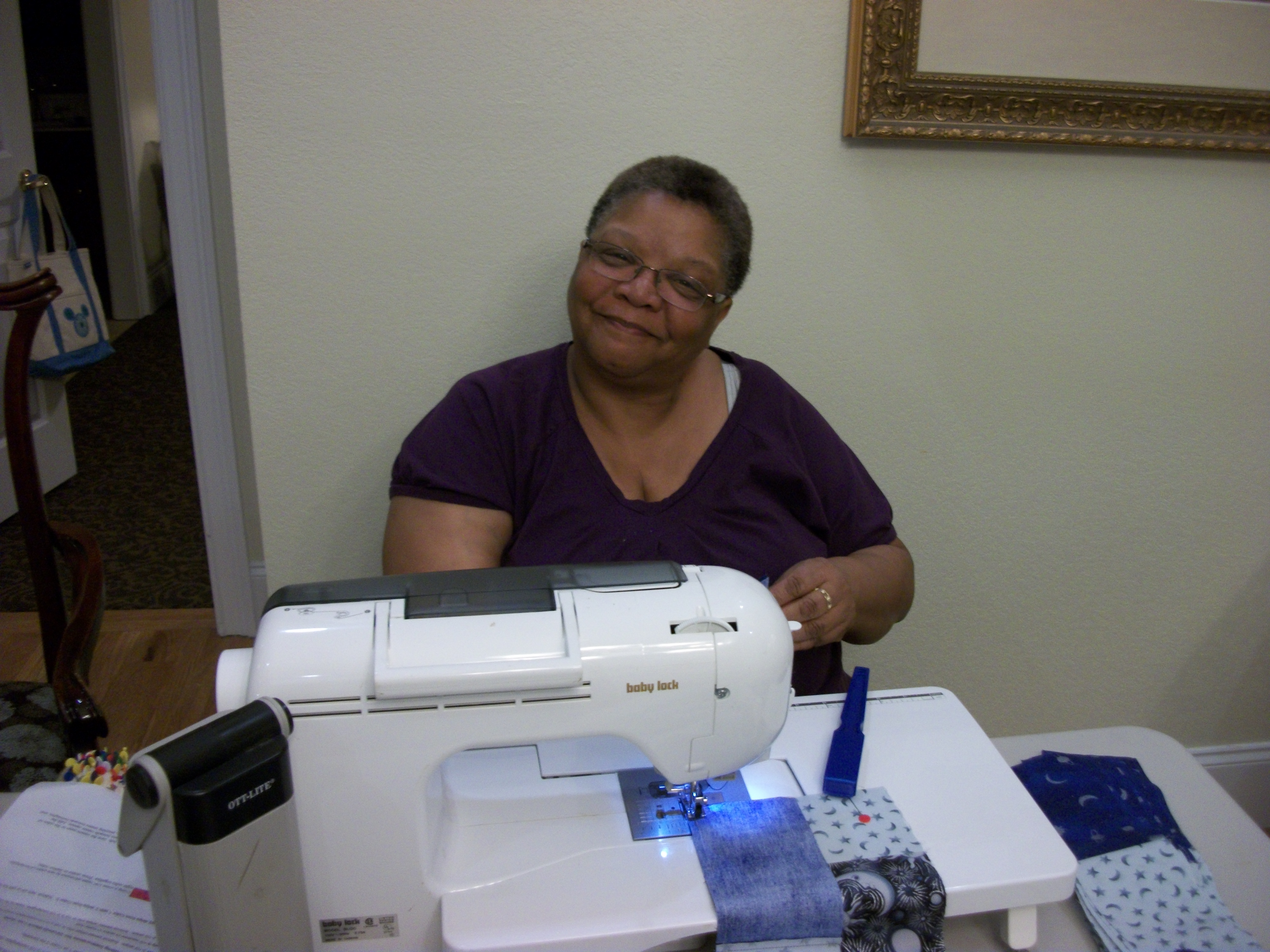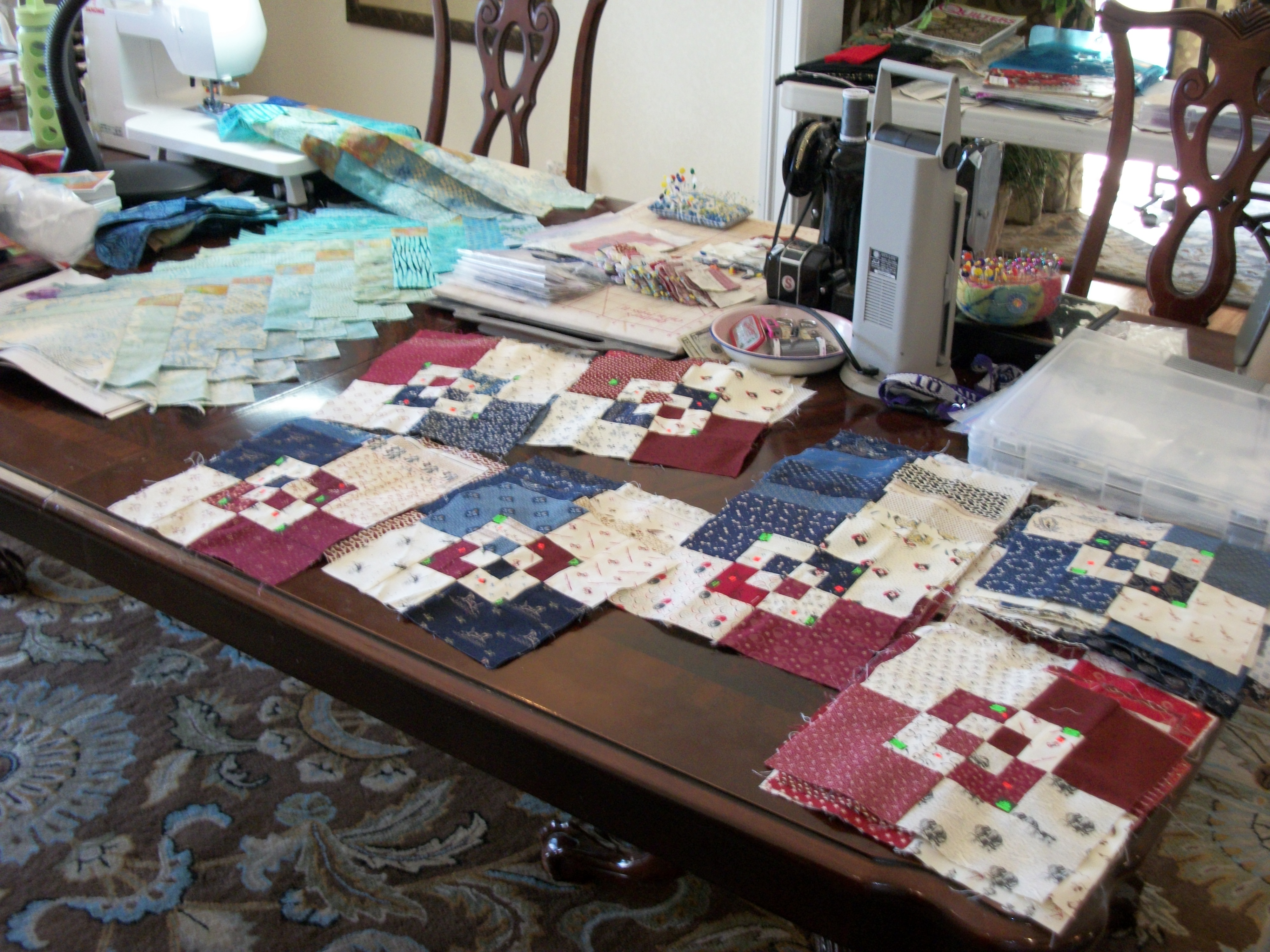 Since I fly into Norfolk from Maine and since Libia comes from Mexico City, Rosy, Carrie, and Denise organize and bring all our equipment. Who brings what is now down to a science for them, and everything we need is there: a cutting table, ironing boards and irons (two), a portable design wall, rulers, rotary cutters, sewing tables, a box of food staples (salt, pepper, sugar, tea), and so forth. Carrie always brings me a sewing machine, and Rosy brings me and Libia Ott lights. This year Libia brought her featherweight from Mexico. I had only to bring my project fabrics and small items like scissors, pins, needles, threads, and so forth, which is getting harder with shrinking airline bag sizes and extra charges. We all come with small gifts for each other as well, and that’s always a fun time. You’ll walk away from your machine, and when you return, there will be something special there for you.