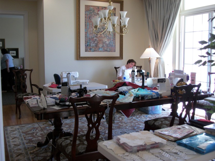 Every year for at least the past 10 years, this group of quilters has gathered in Williamsburg, Virginia, to spend a week with each other quilting, visiting, eating together, visiting local quilt shops, and attending the Mid-Atlantic Regional quilt show in, now, Norfolk. (It started in Williamsburg in multiple hotels.) Other quilters who live in the area also come to visit, to “show and tell,” and to, perhaps, sew with us for a day or two.