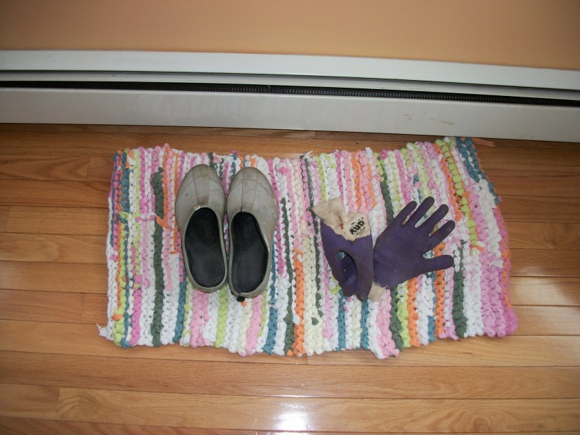 Here it is in use–the mud/garden shoes came from Tara Derr Webb when she moved from Reston to California over…10 years???…ago. I release and feed the chickens first thing in the morning, so I need a pair of mud shoes or winter boots very near the back door: