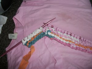 Connecting the loops like potholder loops made too bulky a knot.  So, I opened the loops, slit the ends, and looped the lengths together like I would while making a rag rug.  Since I wasn’t sure I would have enough materials for a braided rug, I decided to knit the strips on big needles (13s).  If you knit constantly, you get a garter stitch, which has interesting texture.  Here’s the start:
