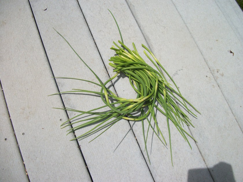To pan saute, your imagination is the limit of fun combinations for additions. Start by stripping leaves from stems. Roll leaves and slice and cut, again, to make squares. Sometimes, though, I just roughly chop greens. Here’s a picture of two bunches of leafy green kale. When cooked, there will be enough for four servings. John and I eat one serving each hot and then we have an asset in the kitchen: cooked greens to be used in other ways, like an omelet. Or, eaten cold. The point I’m making is that greens COOK DOWN rather a lot, so buy enough.