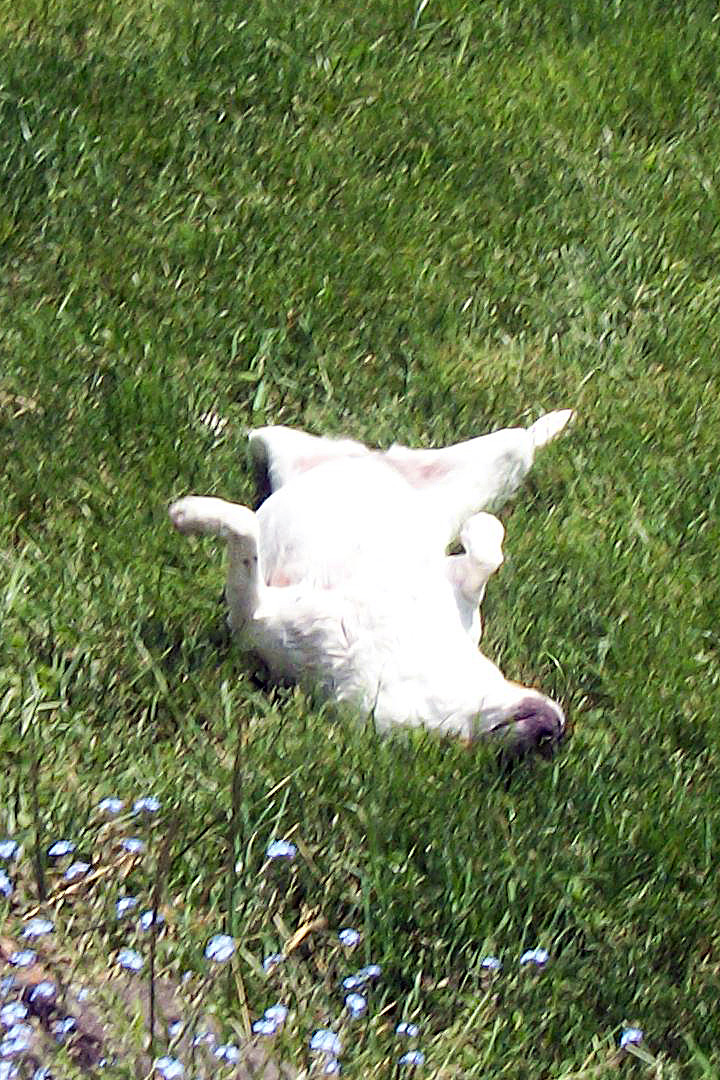 They love to roll in…whatever smelly awful thing they can find.  They’re always so sorry when their owners scream “no, no, go away, don’t get near me, you have to have a bath right now, why did you do it again, I just washed you yesterday, what were you thinking, come right now, no you cannot come in, stand right here until I find a towel…