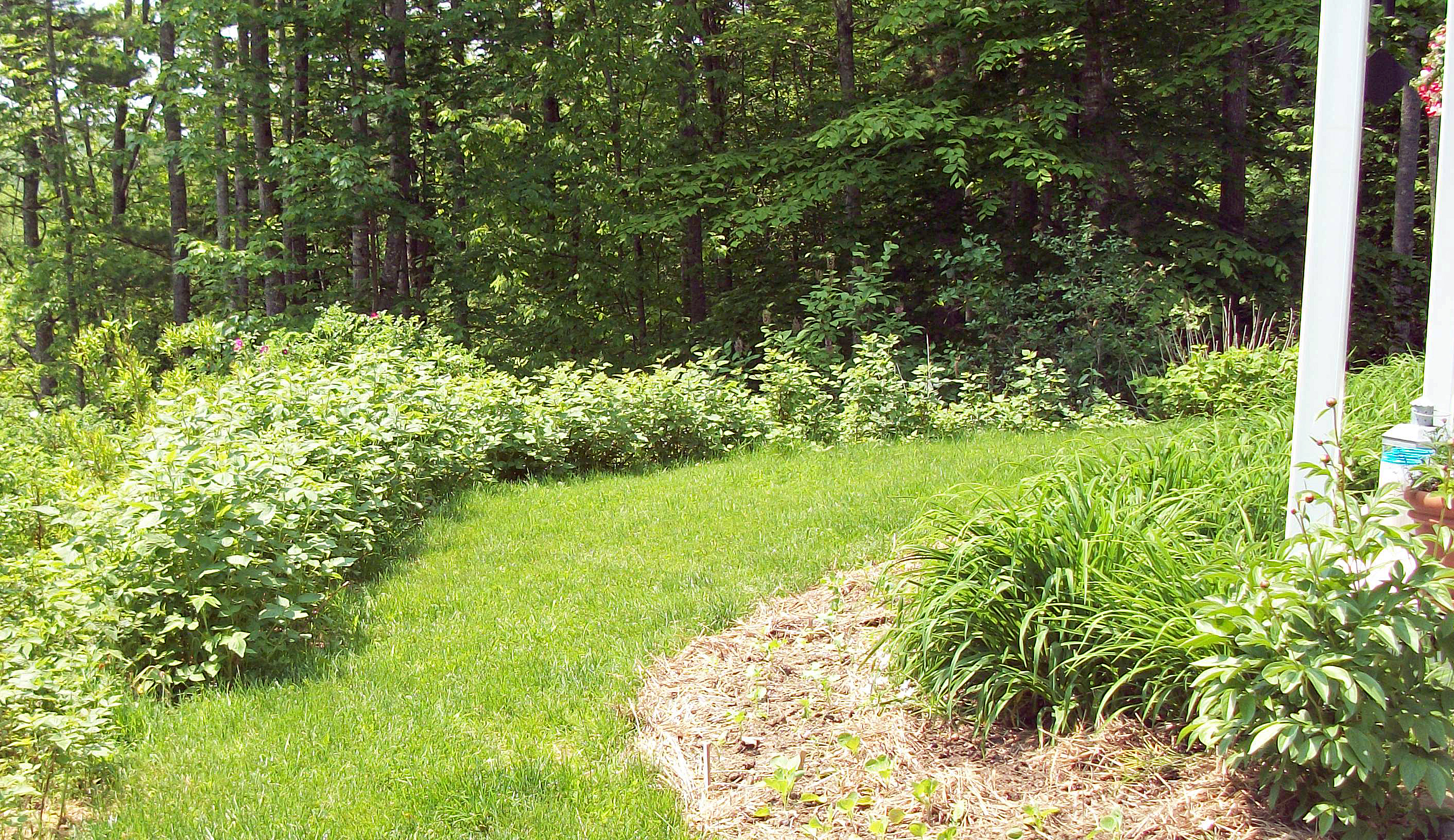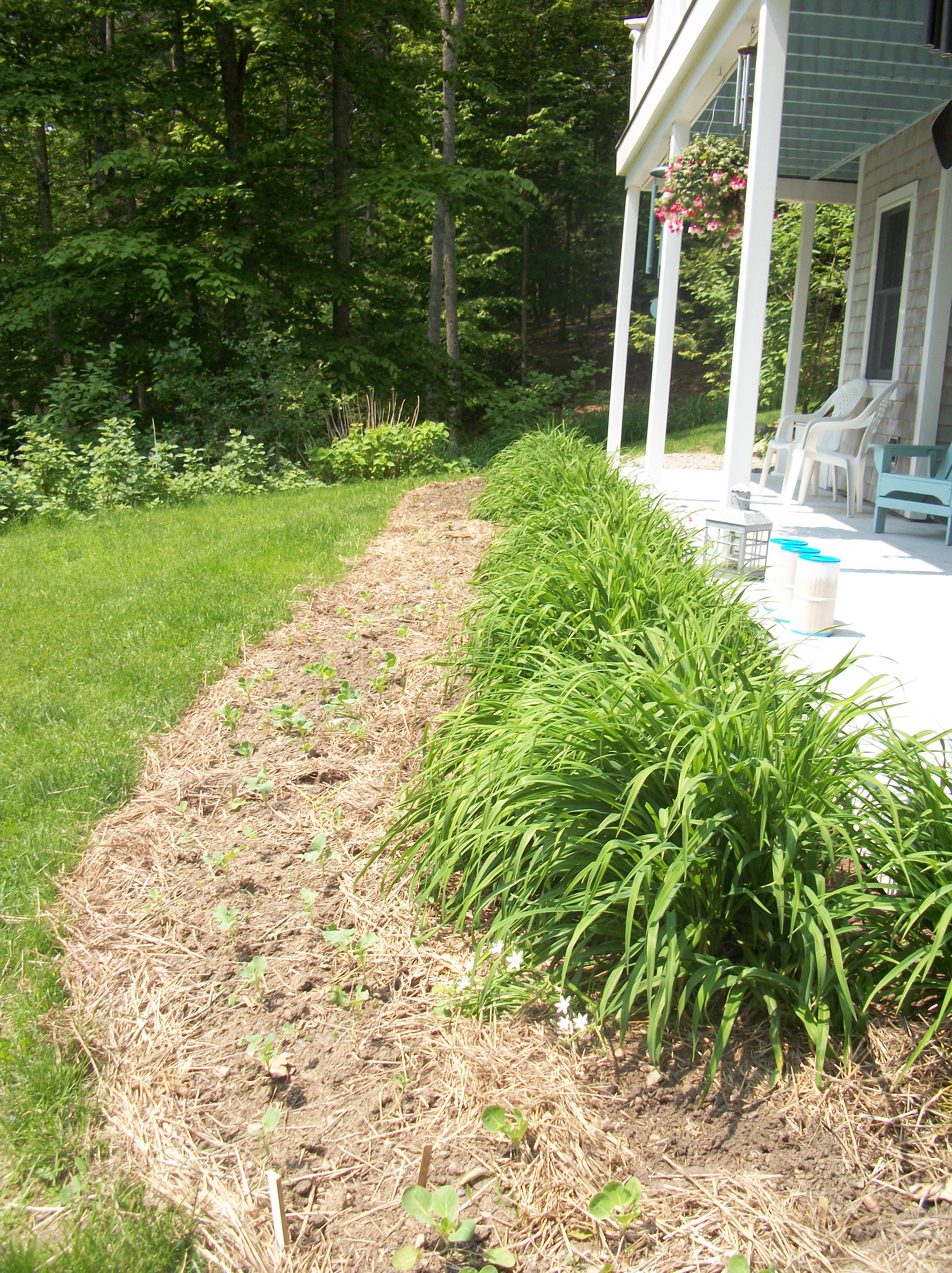 The front bed is planted with cabbage, Broccoli, Brussel Sprouts, zucchini, a Hubbard squash, leeks, extra potatoes, and, at the far end, I threw in some sunflower seeds. In the foreground, peeking out from a daylily, are some white flowers–Star of Bethlehem–a flower my grandmother in Georgia brought up from the swamp, planted in her front hard–when I was a baby or earlier. They now cover the front yard in the spring. The daylilies are setting buds, and the wind chimes along the porch sing so sweetly in a soft breeze. Beyond you can see how dense and dark the Maine woods get in the summer. They are full of mystery and beckon one inside. There’s an intermittent creek at the edge of the woods, and by now, Jack in the Pulpit will be blooming all along its edges.
