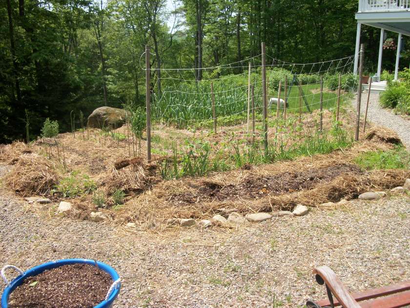 The gardens are all planted. Several days of rain has been terrific for all the seeds and little seedlings. Since I took these pictures about a week ago, the beans (dragon’s tongue, haricot verte, and a dry climbing bean) and–hold on to your hats since they produce SO much–the zucchini are up. So are the kale, the lettuce, the beets, and the radish. I don’t see the Hubbard squash I planted next to the zukes in the front bed yet though. And I forgot to check for the winter squashes along the driveway now that the sun is out. The potatoes are sprouting in their tubs. No sign yet of the carrots or the cukes. Here are some pictures of what is now an early garden, but one that is GROWING hourly.