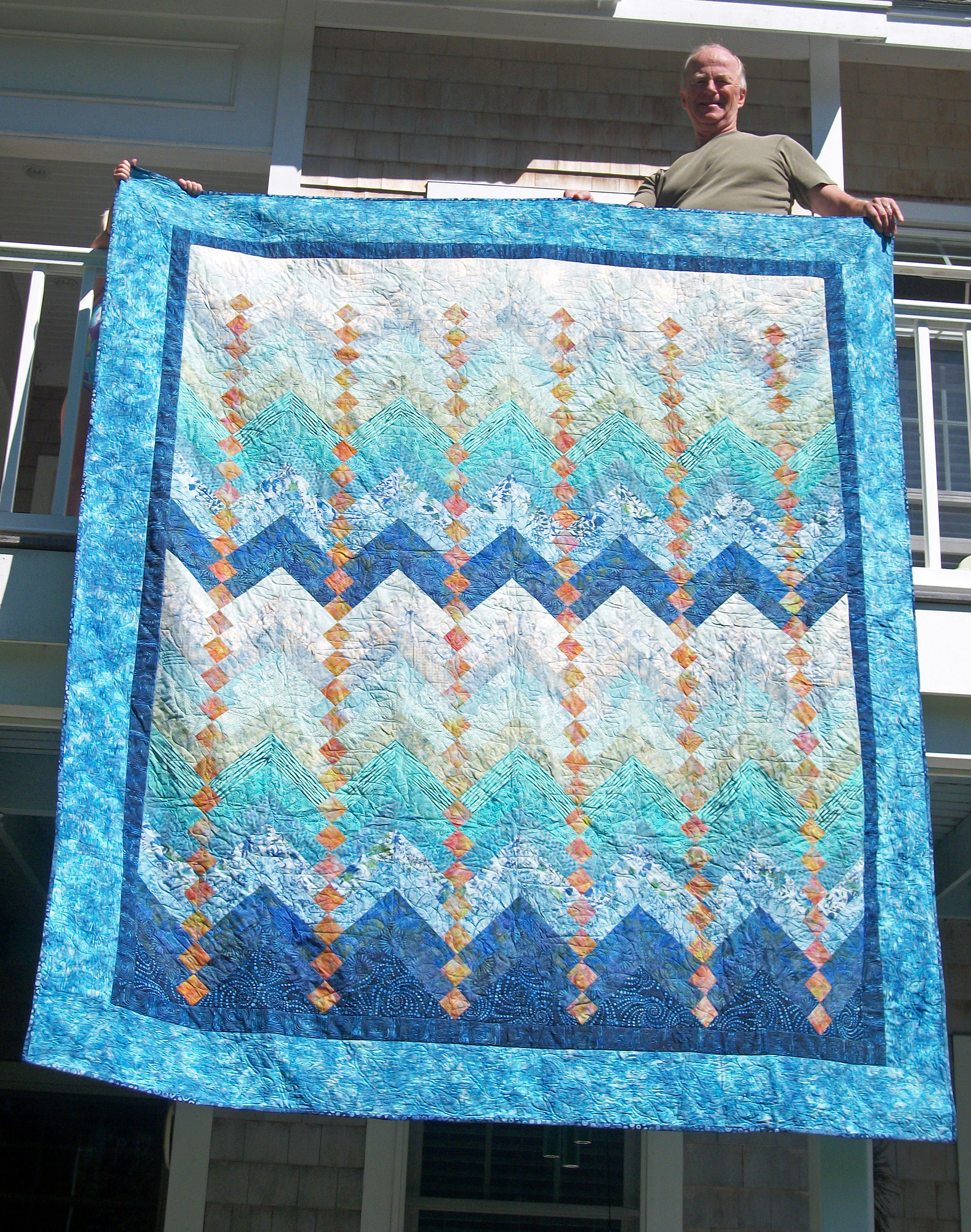 Since Corinne lives on Isle of Palms, SC, 2 blocks from the beach, I wanted to use blues, greens, and sandy colors, from light to dark–with a contrasting inner diamond of red/orange–all batiks.
