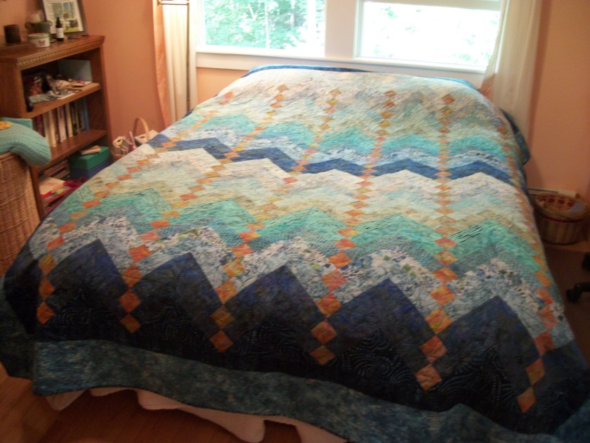 So, here’s the finished quilt across the end of the bed: