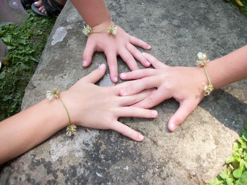 Here’s a picture I particularly loved–taken at the Camden Amphitheater during a music concert.  Wilhelmina’s hand is missing.  The children were new to making clover chains and insisted I make crowns, necklaces, and ankle/wrist bracelets: