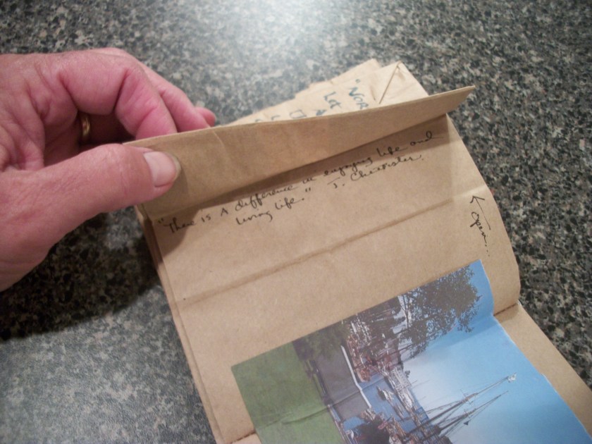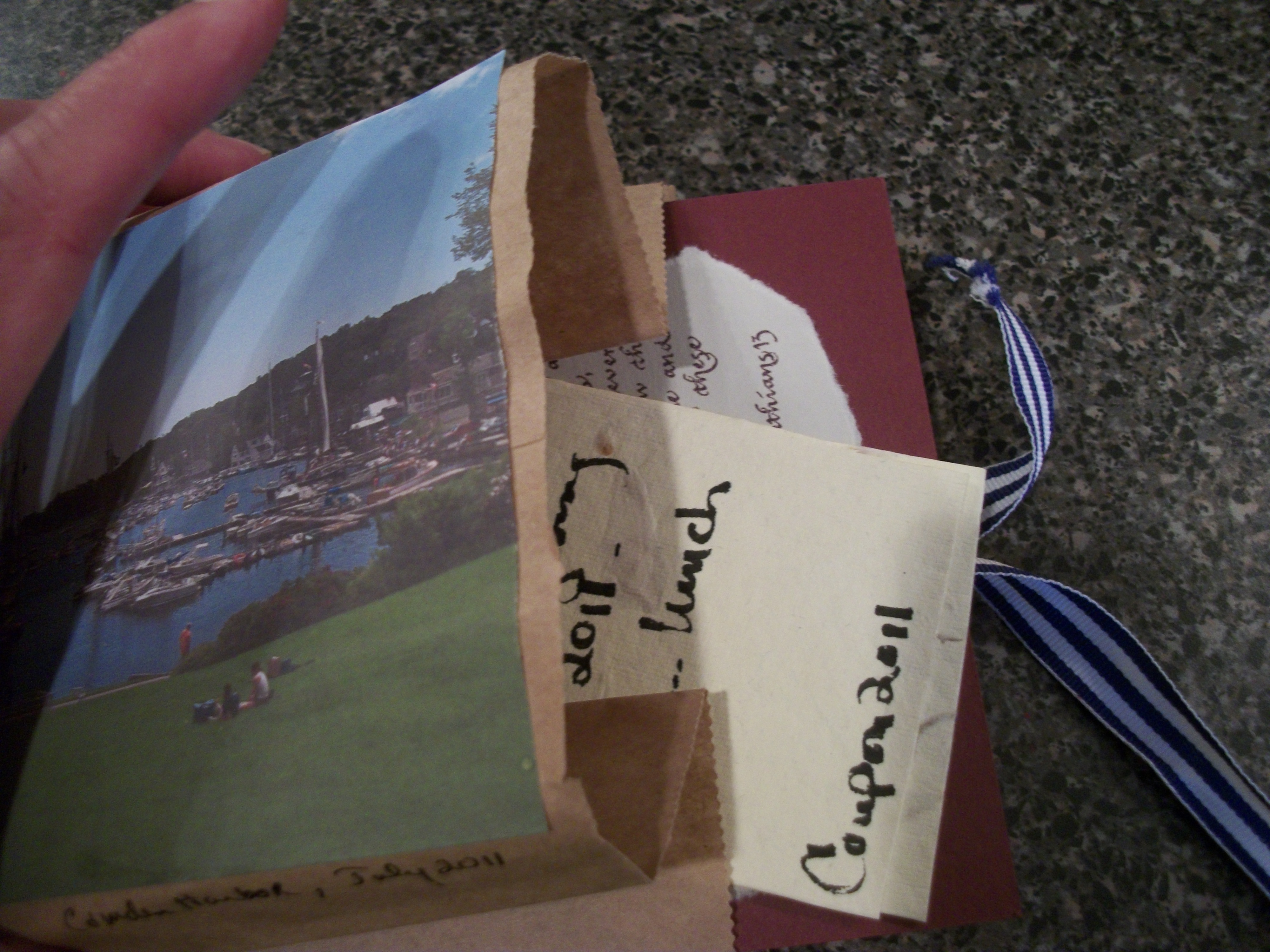 Here’s the outside of the brown paper lunch bag book–the buttons come from a quilt shop in Charleston, SC–People, Places, and Quilts.