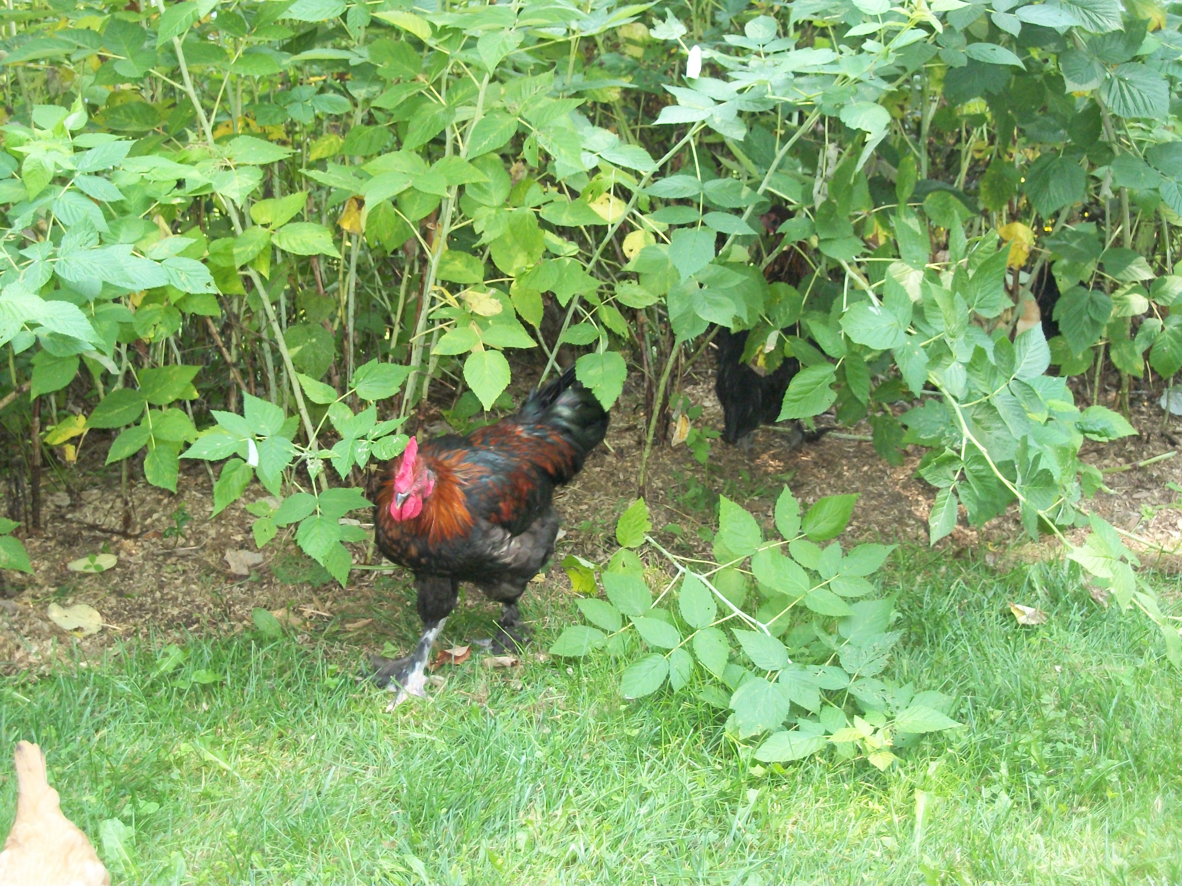 The whole slope is now impenetrable–we called it the chicken briar patch since the chickens love it so much.  They feel safe in there.  The raspberries are THRIVING on their attention, and since we’ve released the chickens from their summer pen, the June bug count has diminished significantly.