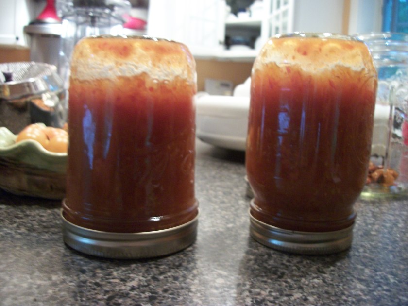 Then, one cooks the mass until it begins to “jelly” according to directions.   Or, coats the spoon well.  The candy thermometer wasn’t especially helpful since the mass didn’t melt down like a berry jelly or jam does.   The mass began to coat the spoon and jell up on the plate, and it turned a deep pumpkin color that was lovely.  So, I jarred it up.