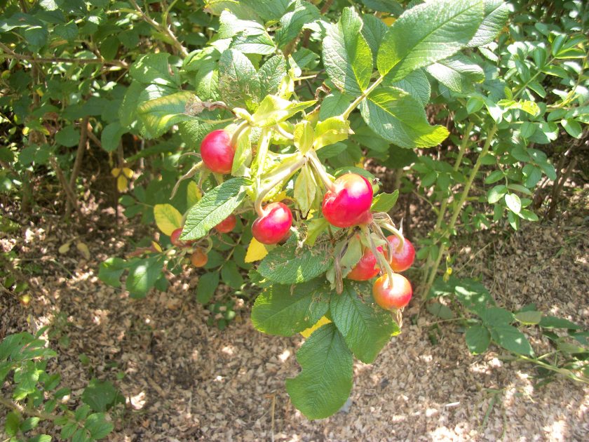 The rugosa’s hips began to catch my eye as the years passed.   For several years I thought one should wait until after the first frost as they’d be sweeter.  I read that in several places actually.  One year I collected the hips and dried them for winter nutritional teas–they’re full of vitamin C–but I never made any.  (I love my black tea with wild honey and real heavy cream too much.)  Also, it seemed to me that by the time the first frost came, the hips were all dried out and moldy looking.  Last year I got as far as finding information and recipes.