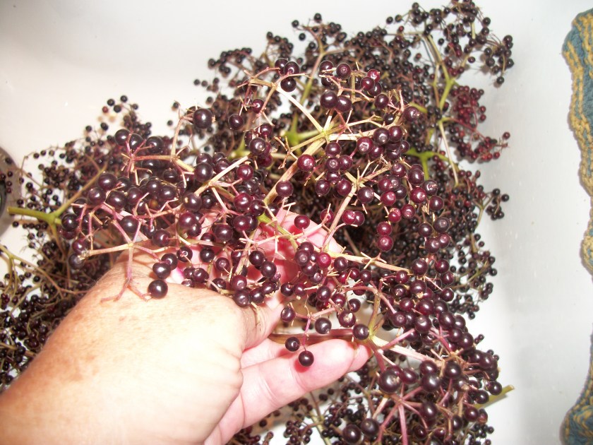 Not long after, I realized–from seeing the leaves on our purchased elderberry–that the pesky tree on the wall was also an elderberry.  So, we left it alone I collected those berries as well.  Here they are in my kitchen sink–ready to be picked off their stems and frozen: