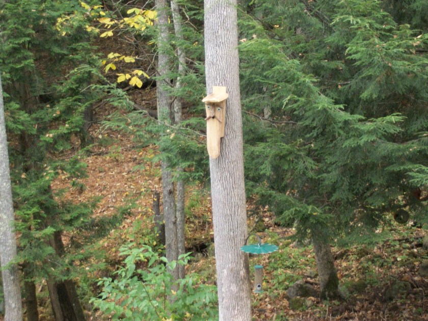 Here’s a picture of the bird house that John bought and hung on a tree where we can see it all winter long. People hang lots of bird houses in their woods around their houses in Maine–they provide shelter for the birds that winter off in a storm. John wants to make some with the g