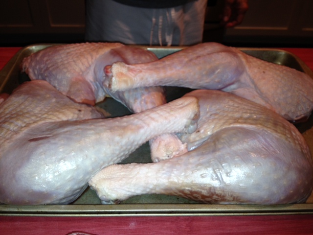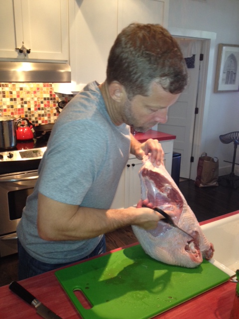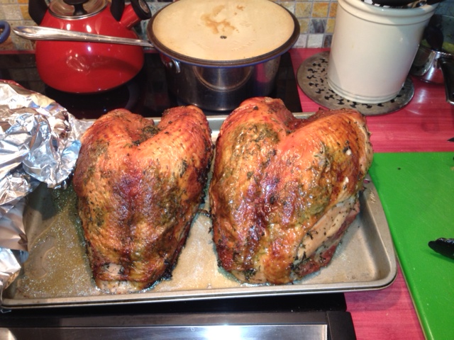 I didn’t get a picture of the cooked rolled legs, but here are the turkey breasts about to be carved. The meat was very tender and moist: