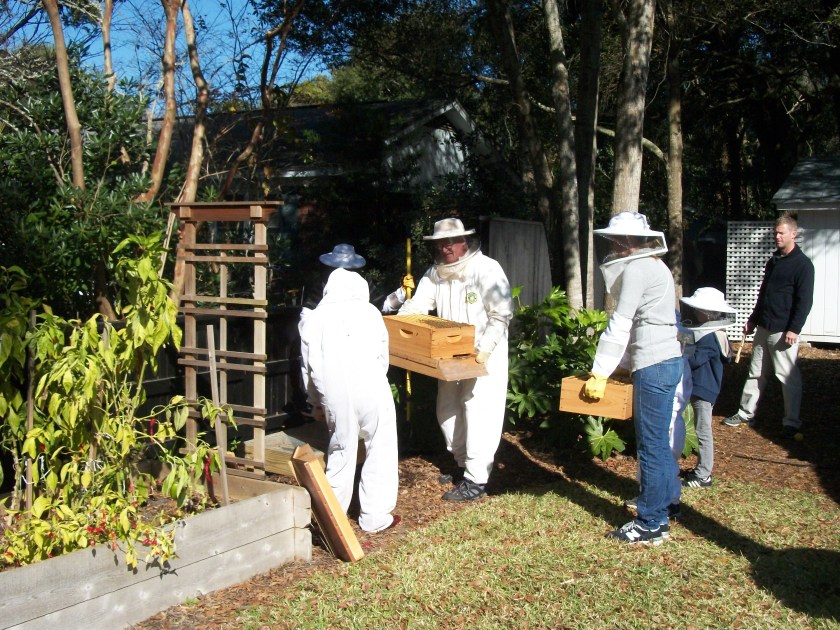 Tami’s hive was in a shady part of the yard, however, and had acquired a worrisome kind of little beetle that can harm the hive. So, just after Thanksgiving, she and her bee mentor, with the help of her fellow beekeeper Kay, decided to move the hive to a sunnier spot in the yard.