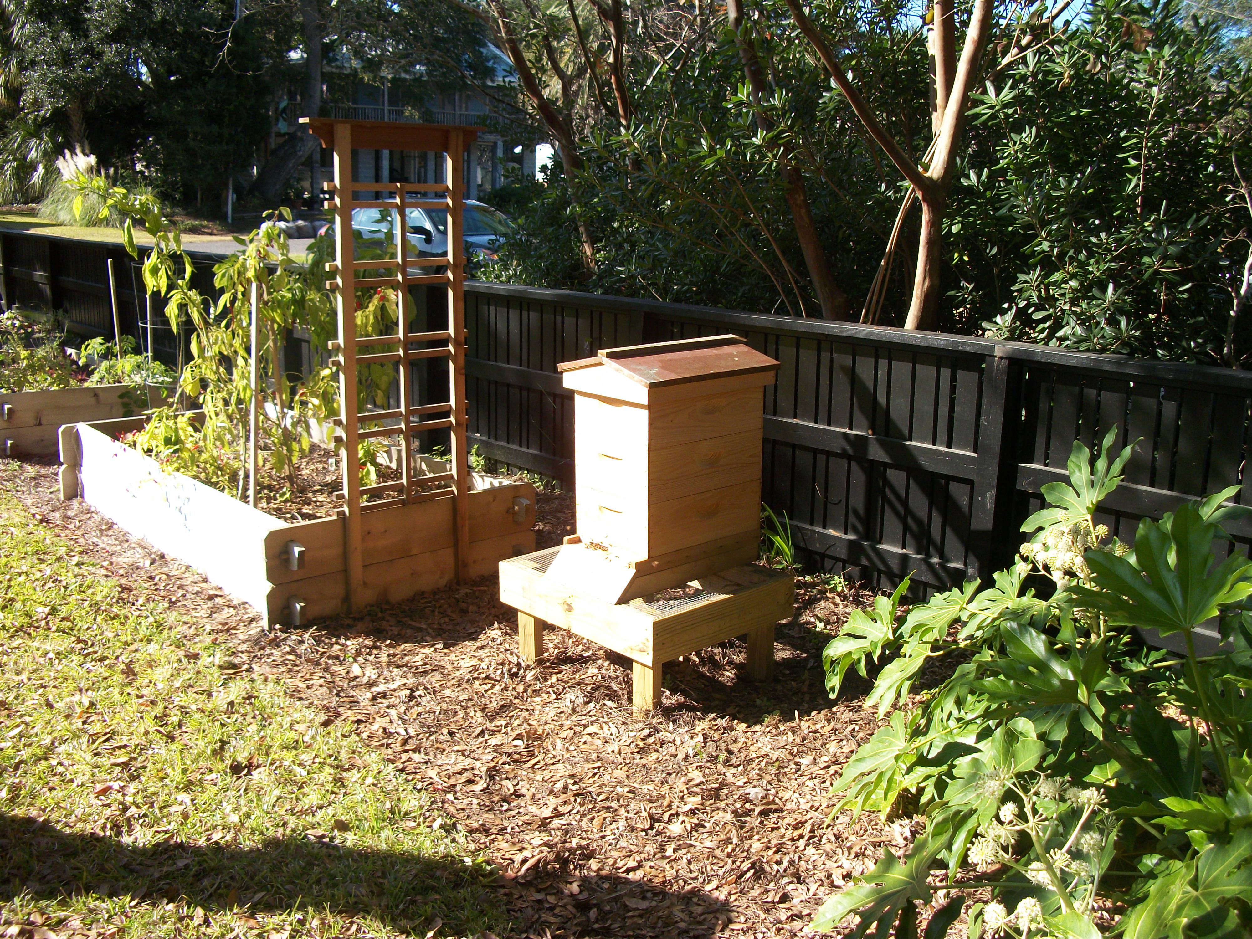 Here’s the hive in its sunny new site alongside Tami’s raised vegetable beds: