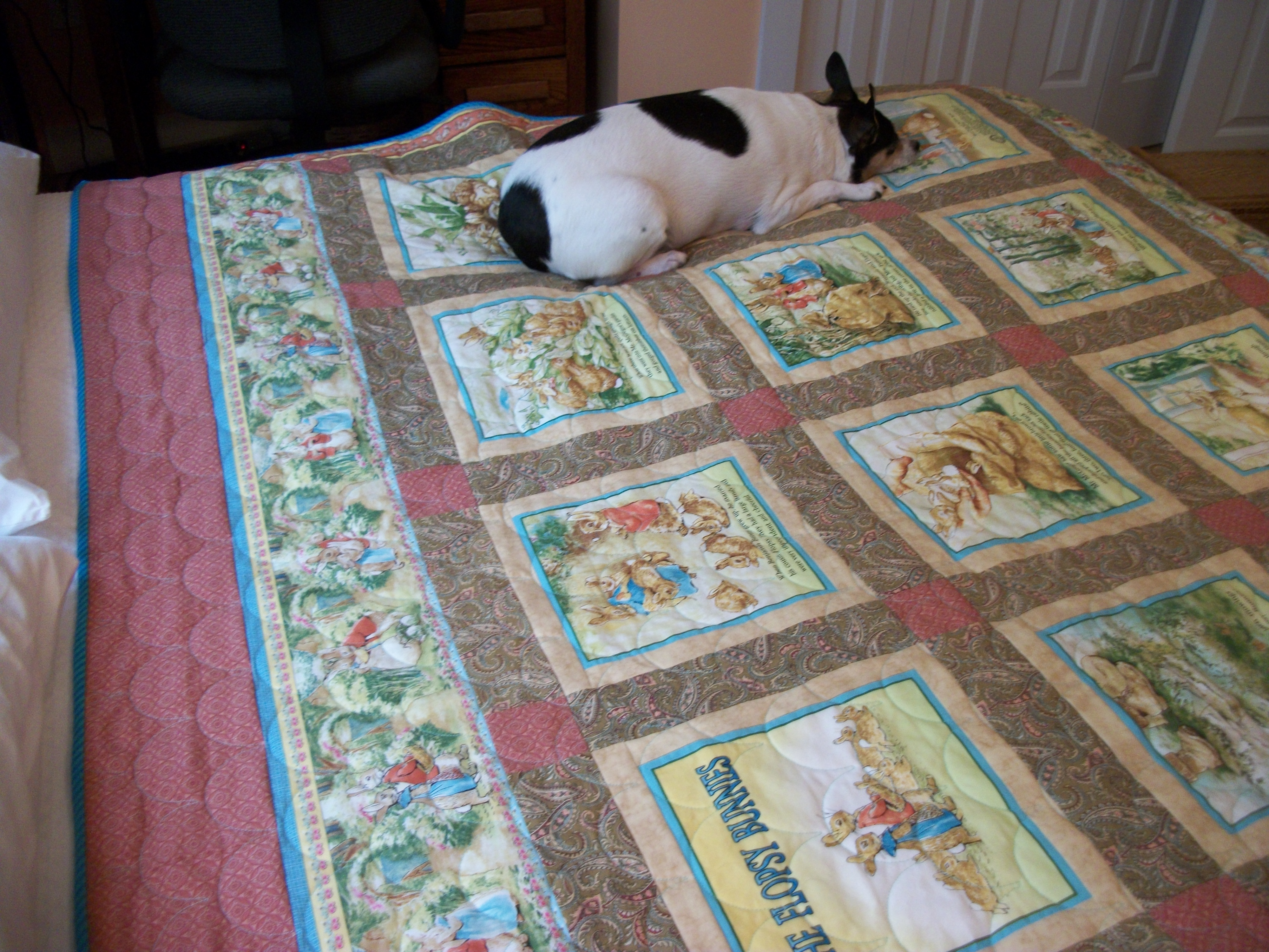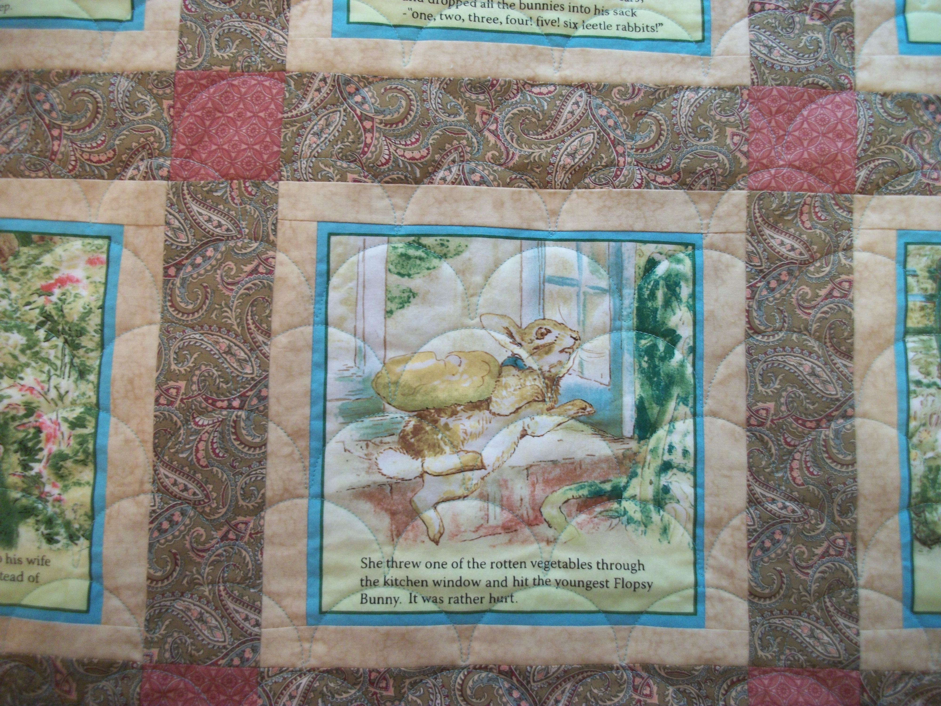 Two years ago when I was in Williamsburg with my dearly beloved quilt buddies who live in Virginia, on our last day, I bought some adorable Peter Rabbit-type fabrics from a local quilt store–whose name I am not going to recall. (But if you are in Williamsburg, it’s near the college, and it’s very nice.) The panels were meant to be made into fabric books. They tell a story. But, I thought them perfect for baby quilts. I bought two sets, and each had a panel, some border fabric, and some backing fabric. Quick quilts, I thought. Ha!