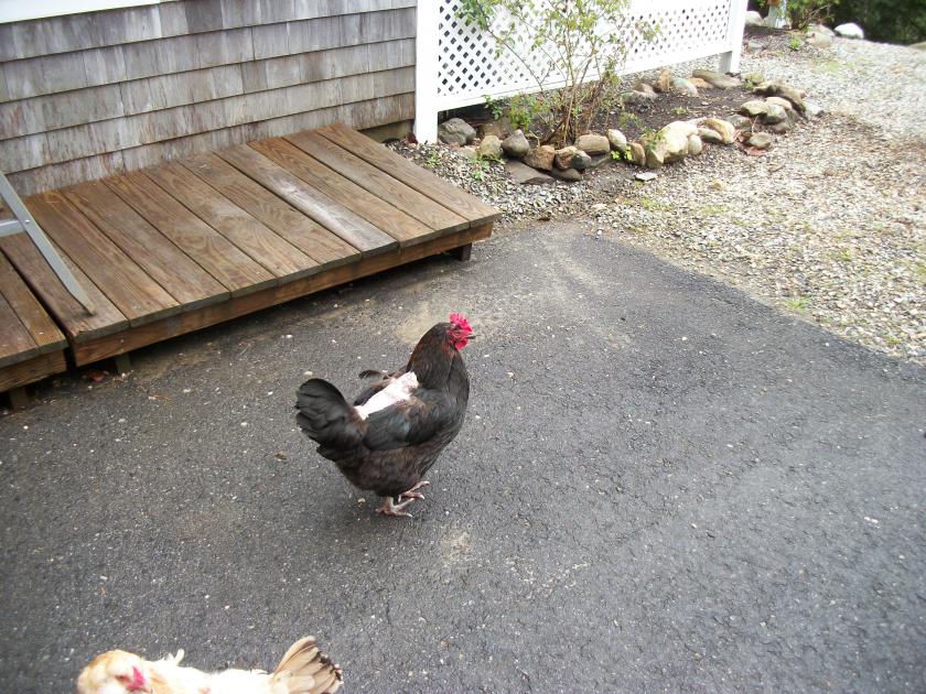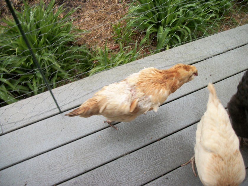 And my beautiful Pearl, the youngest and the lowest on the chicken totem pole, is a wreck of broken feathers and bare spots.  I’m really worried about her.  As the lowest in the flock, she hangs with the rooster for protection, so she’s “available” all the time.