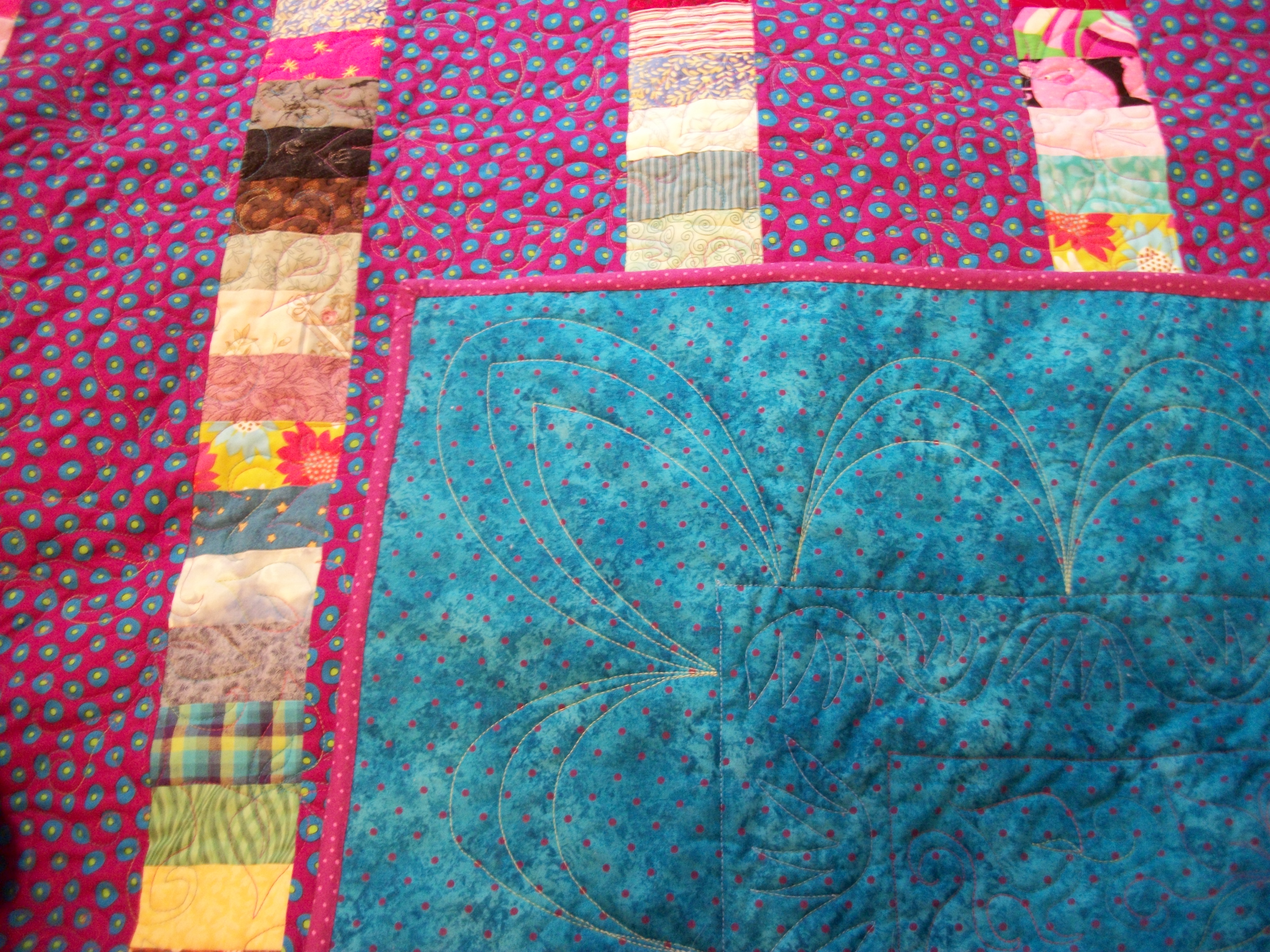 I don’t know if the next photo will do justice to the free-hand quilting–it’s some of my best and I felt really good doing it on the long-arm–it’s a three-leaf pattern combined with a kind of twining vine that works like a meander to help me travel around.  The thread is a variegated purple, green, magenta, blue blend from Signature.