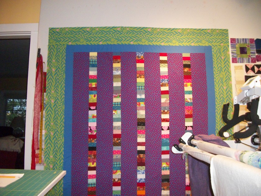 Here’s how it started on the design wall–after I took a strip of the rectangles to Marge’s Mainely Sewing and, in passing, waved it over this purple/lime green fabric–which just made everything sing.  It’s going to be a bar quilt–with a strip of what is called “Chinese Coins”–or rectangles stacked into a bar.