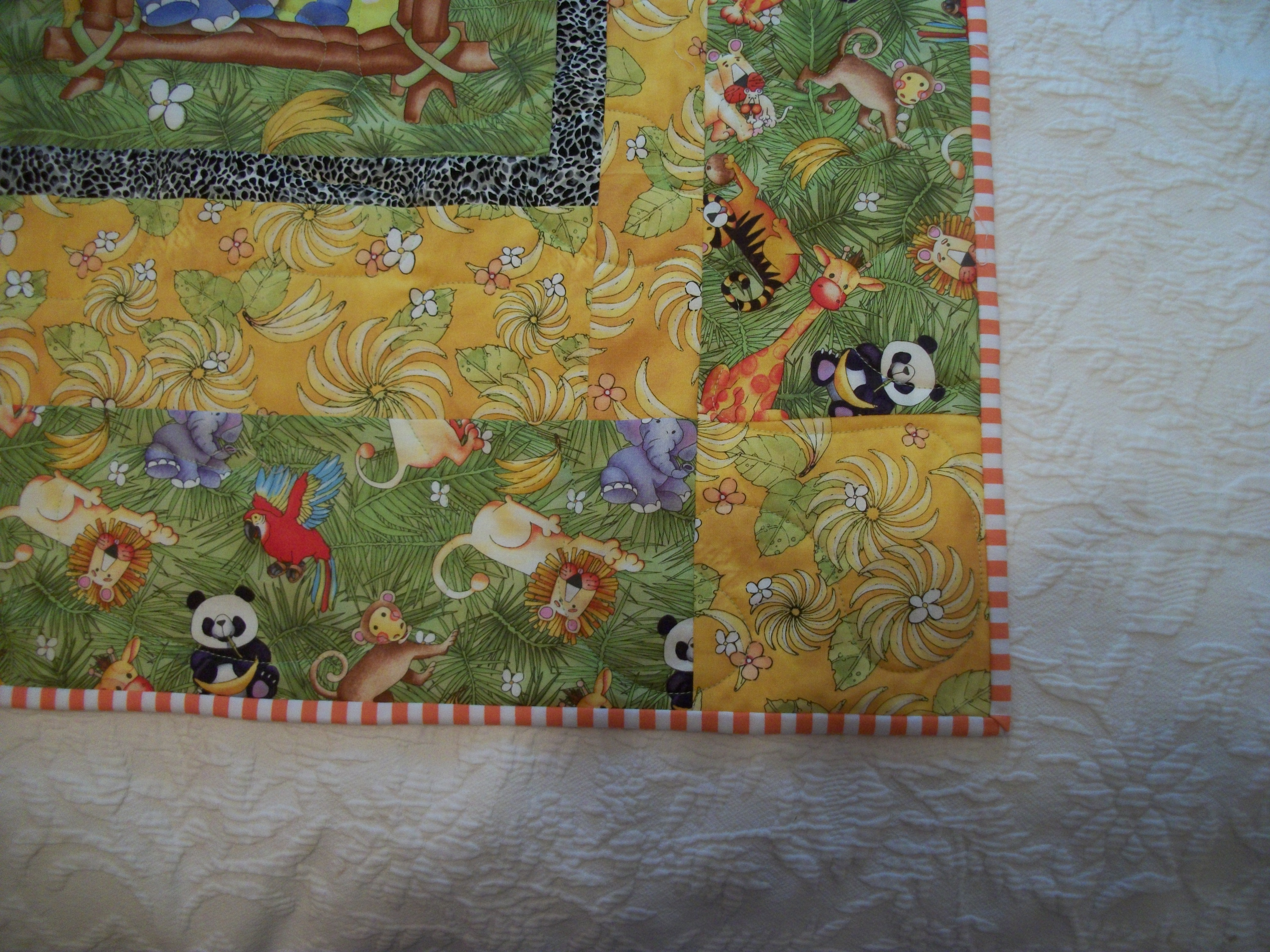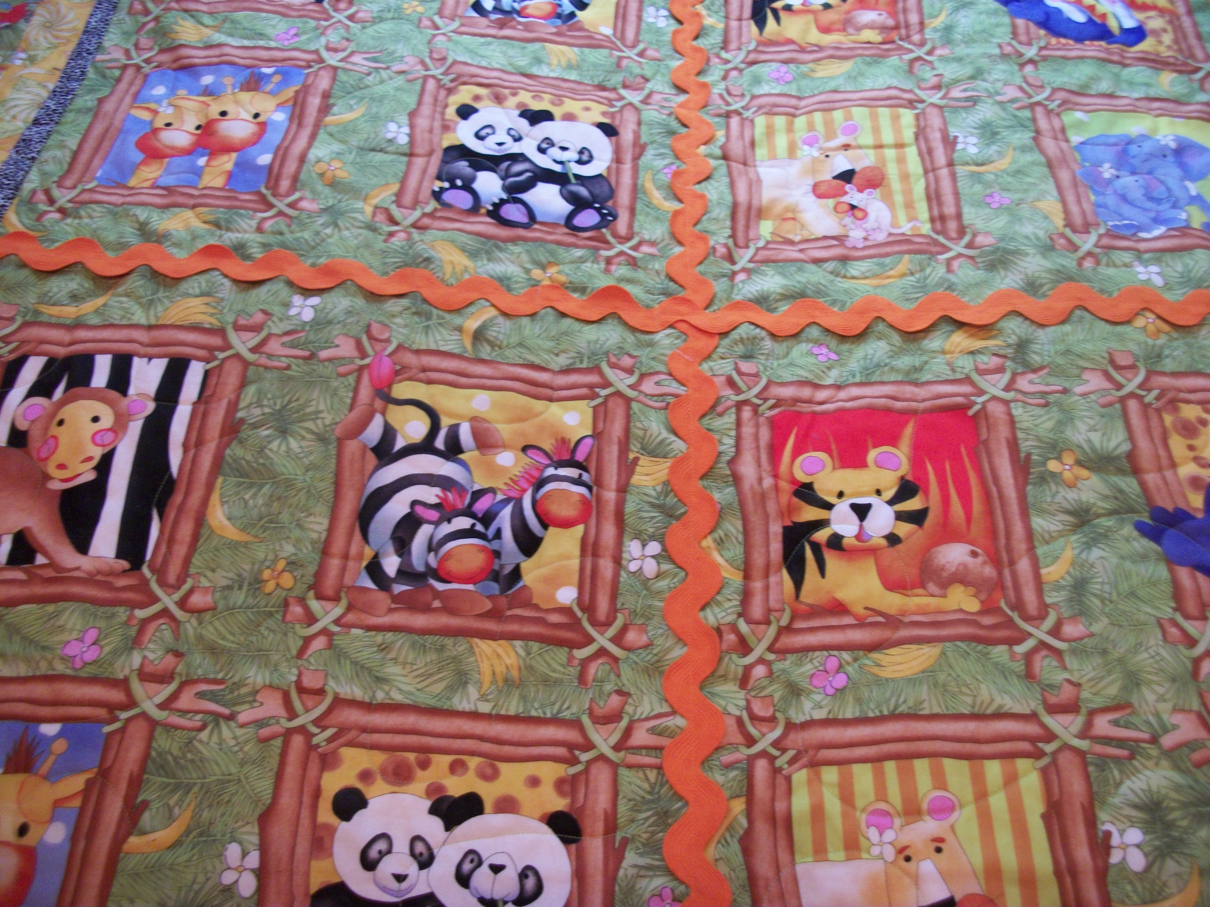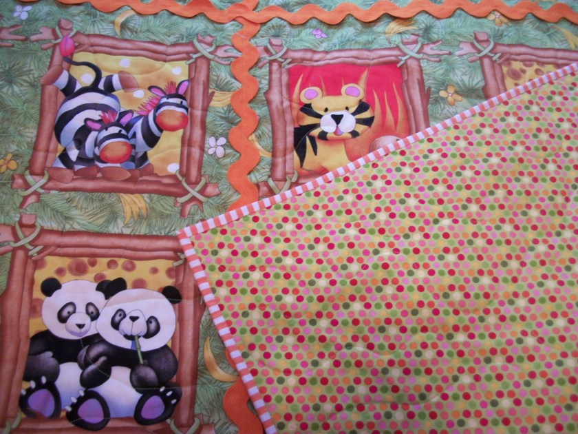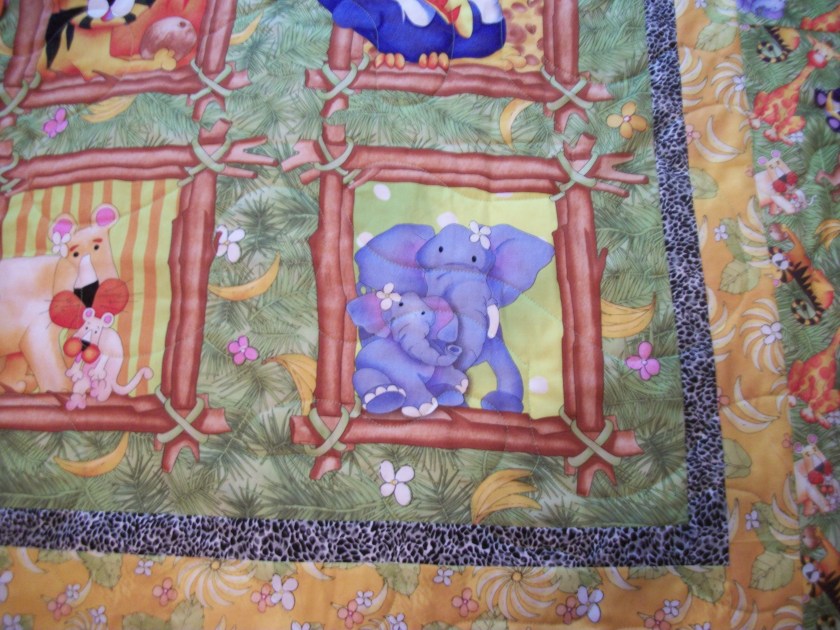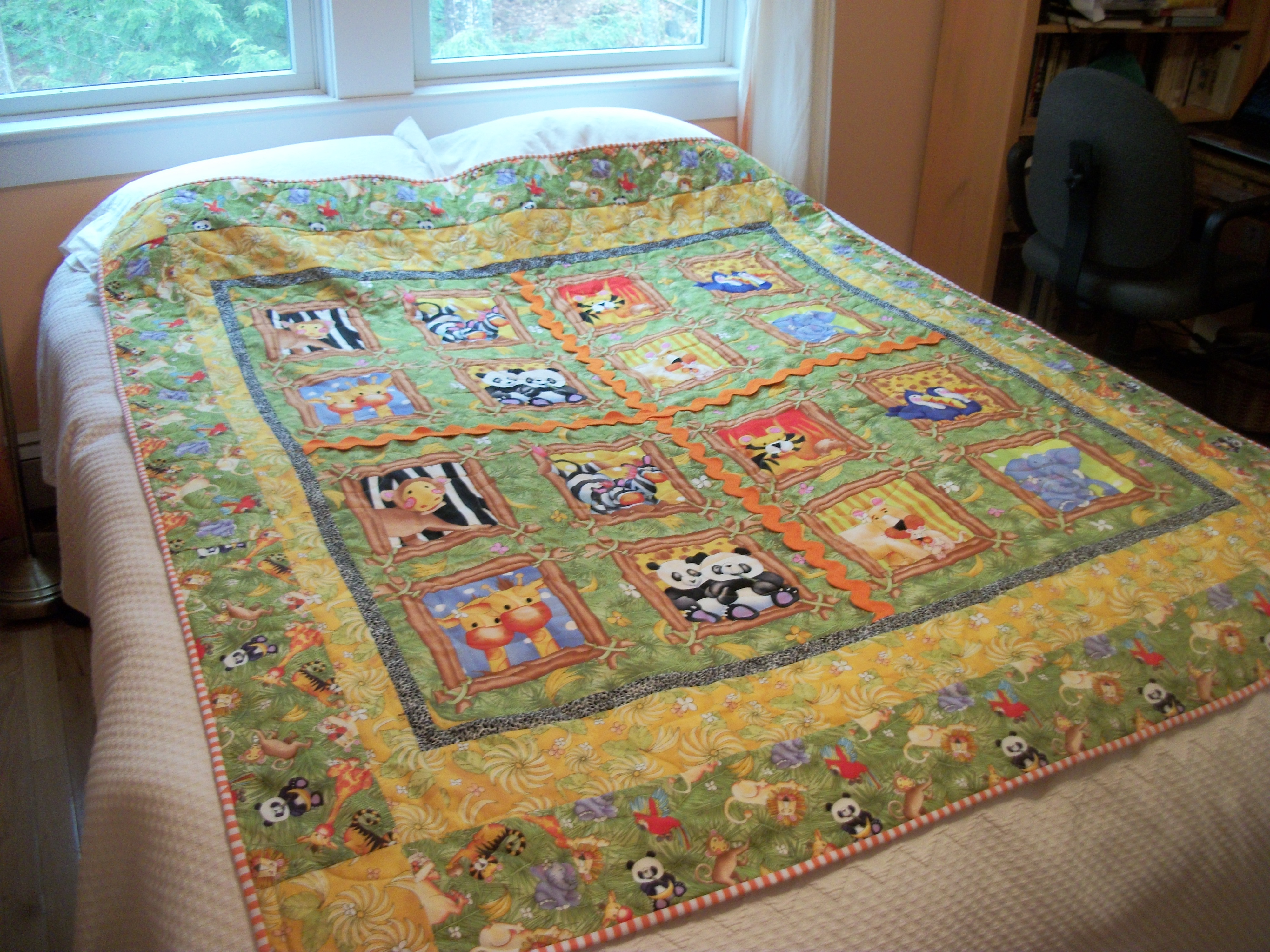 Here’s “Julia’s Jungle”–made from a kit assembled by Debbie at Quilt Diva’s in Rockland.  Debbie and Doris of Quilt Divas have a terrific selection of kid-friendly fabrics.