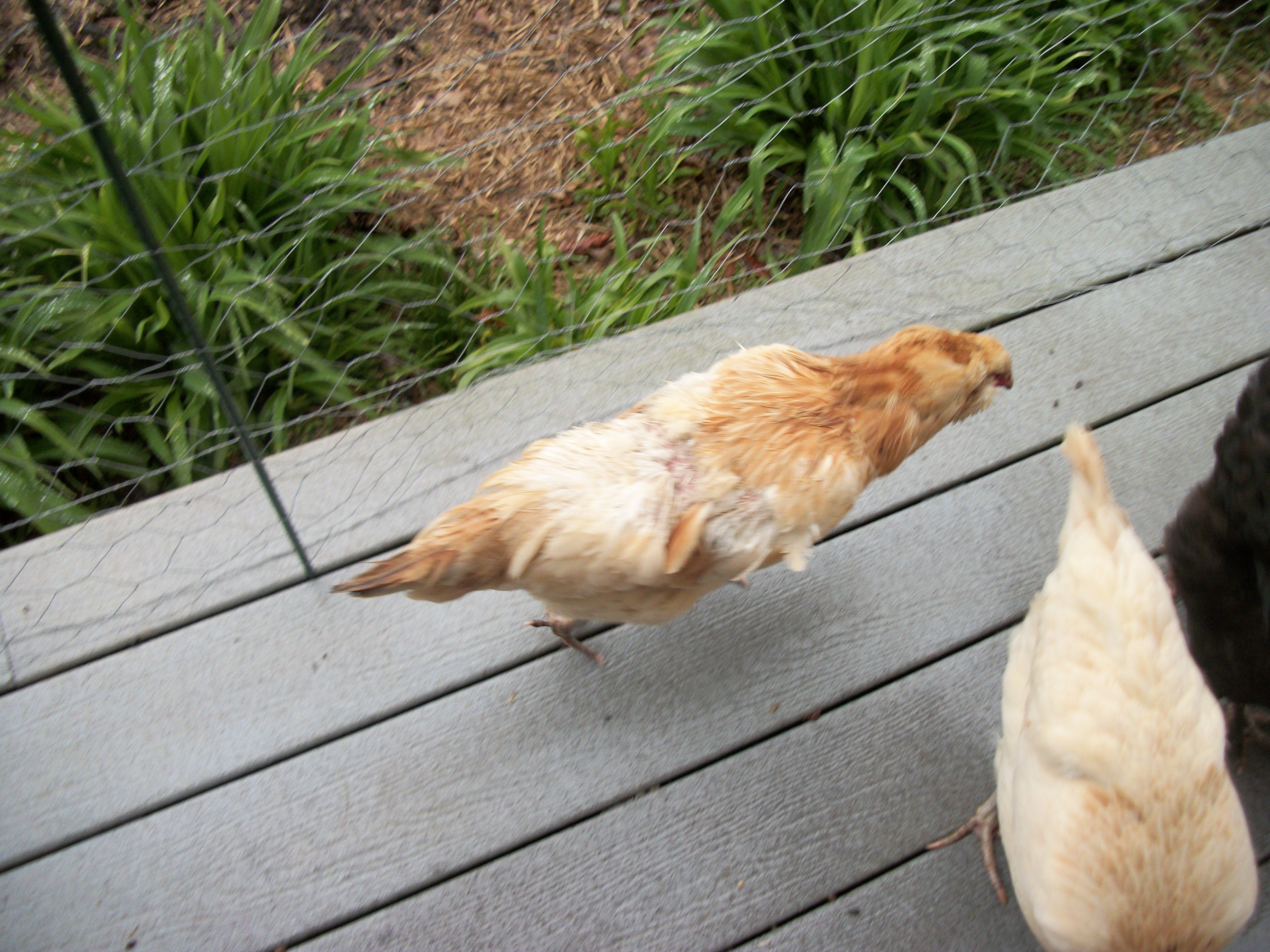 Poor Annie Chickie’s back is entirely bare of feathers.