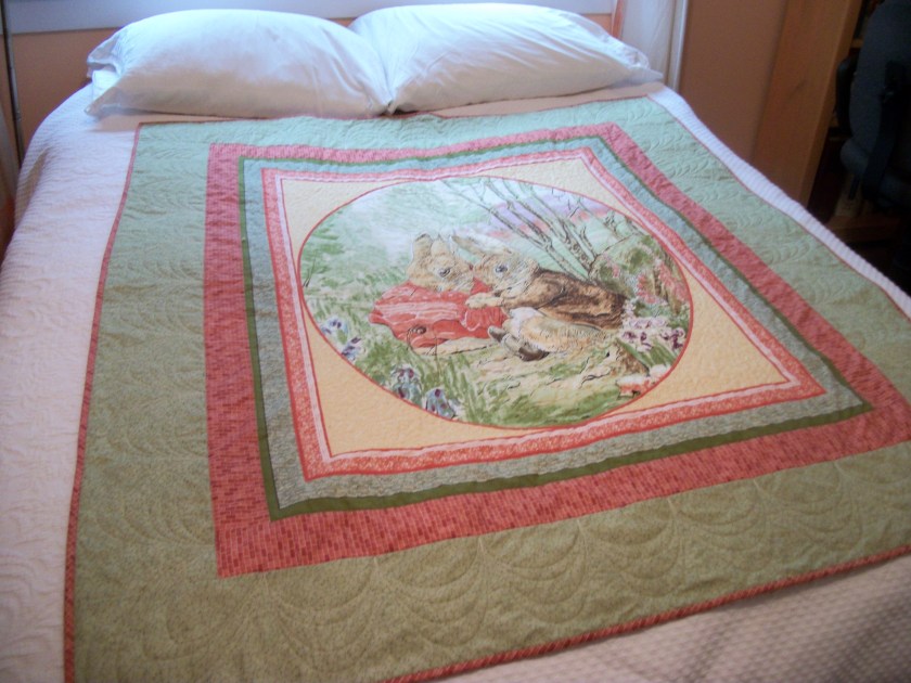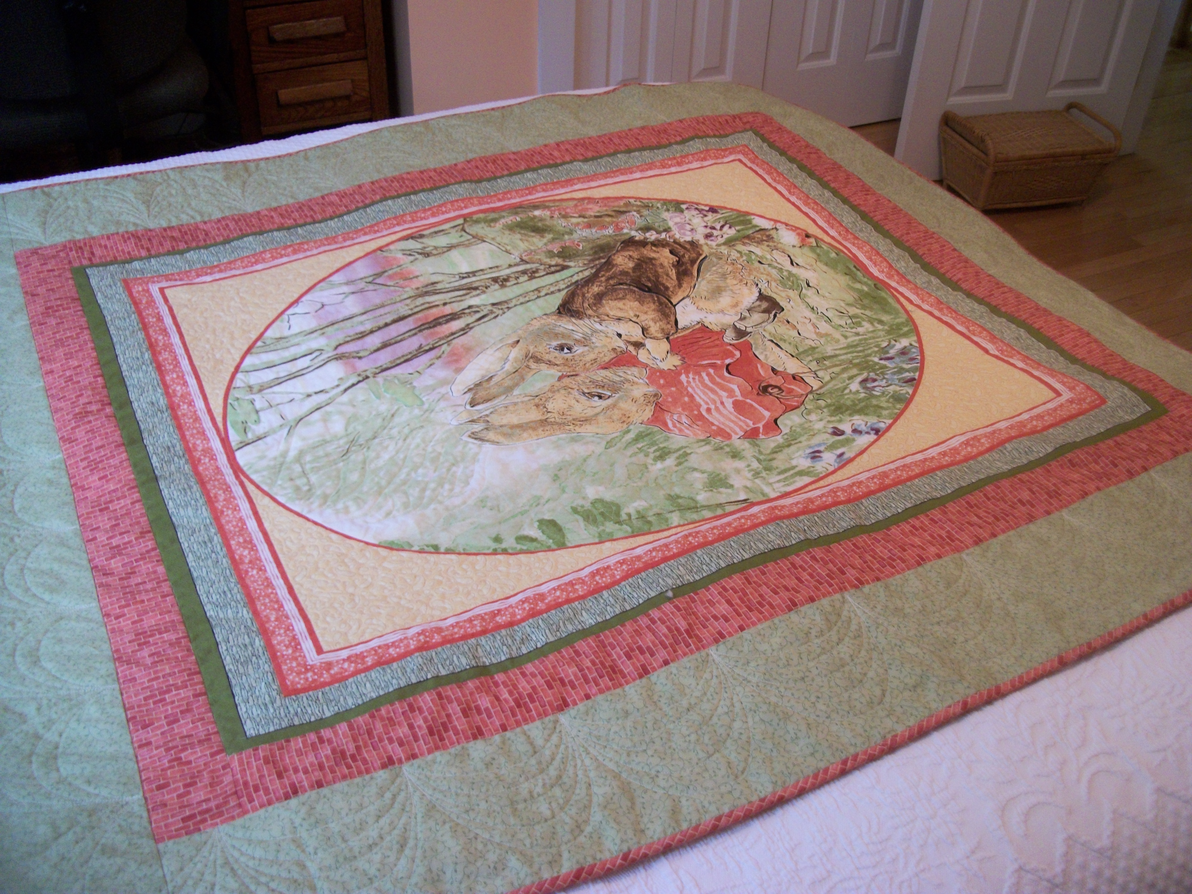 My dear friend Rosie Pilkerton gave me this fabric panel about two years ago.  The kit was meant as a wall hanging–or an infant quilt–and came with backing and batting.  Rosie made it as a wall hanging and did a lot of wonderful free-motion quilting around the scene of the two rabbits.