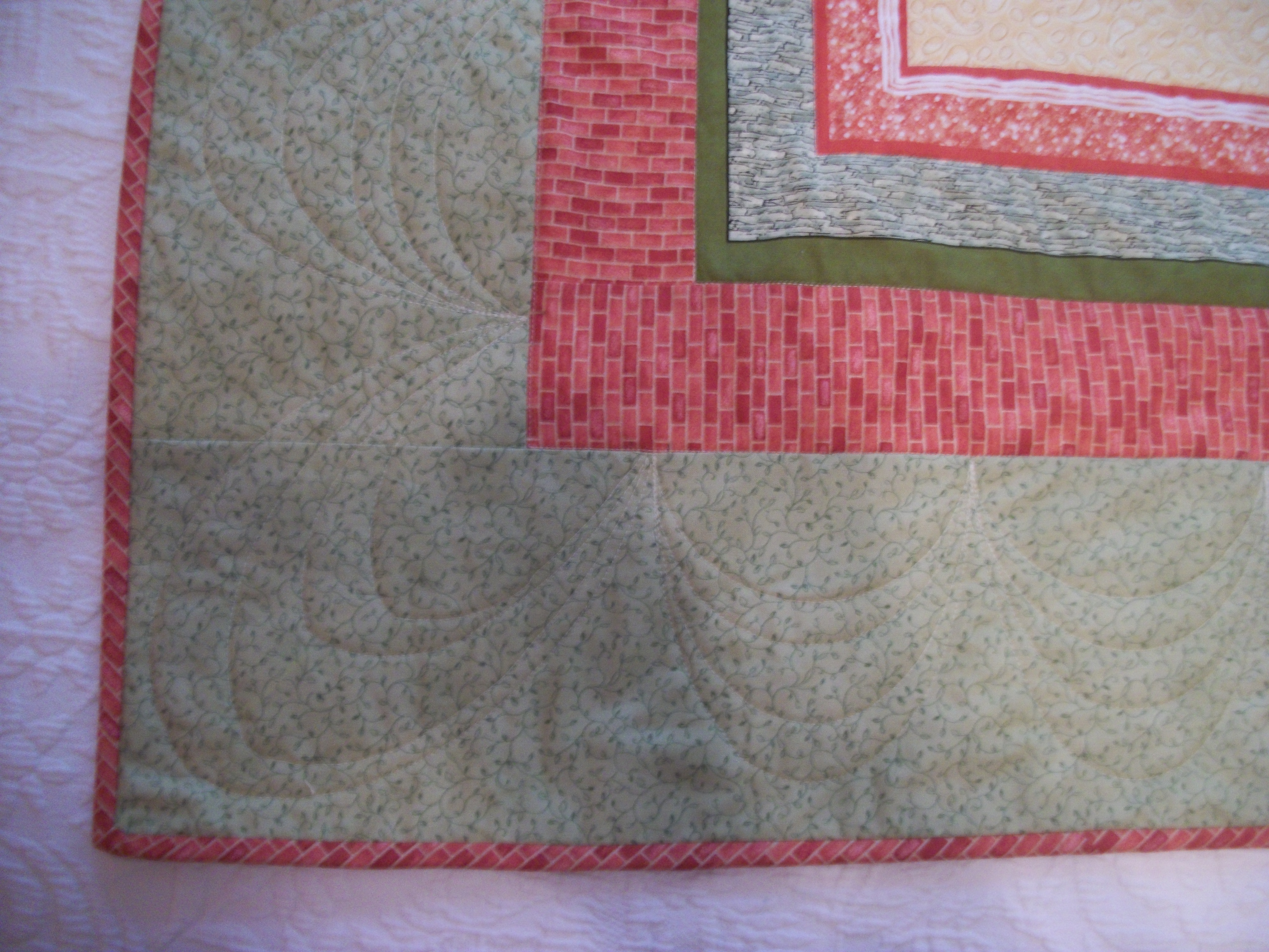 The backing is a soft cream polka-dot fabric, which blended beautifully with the front.  And you can see how pretty that swag border is from the back.  And, the nice lines made when I stitched down the borders from the front.