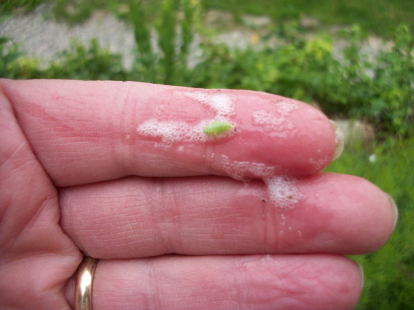 A few days later, Tami identified it while reading her Master Gardeners course book. “It’s a Spittle Bug,” she said.  And the nymph form is bright green and makes itself a ball of surrounding spit.