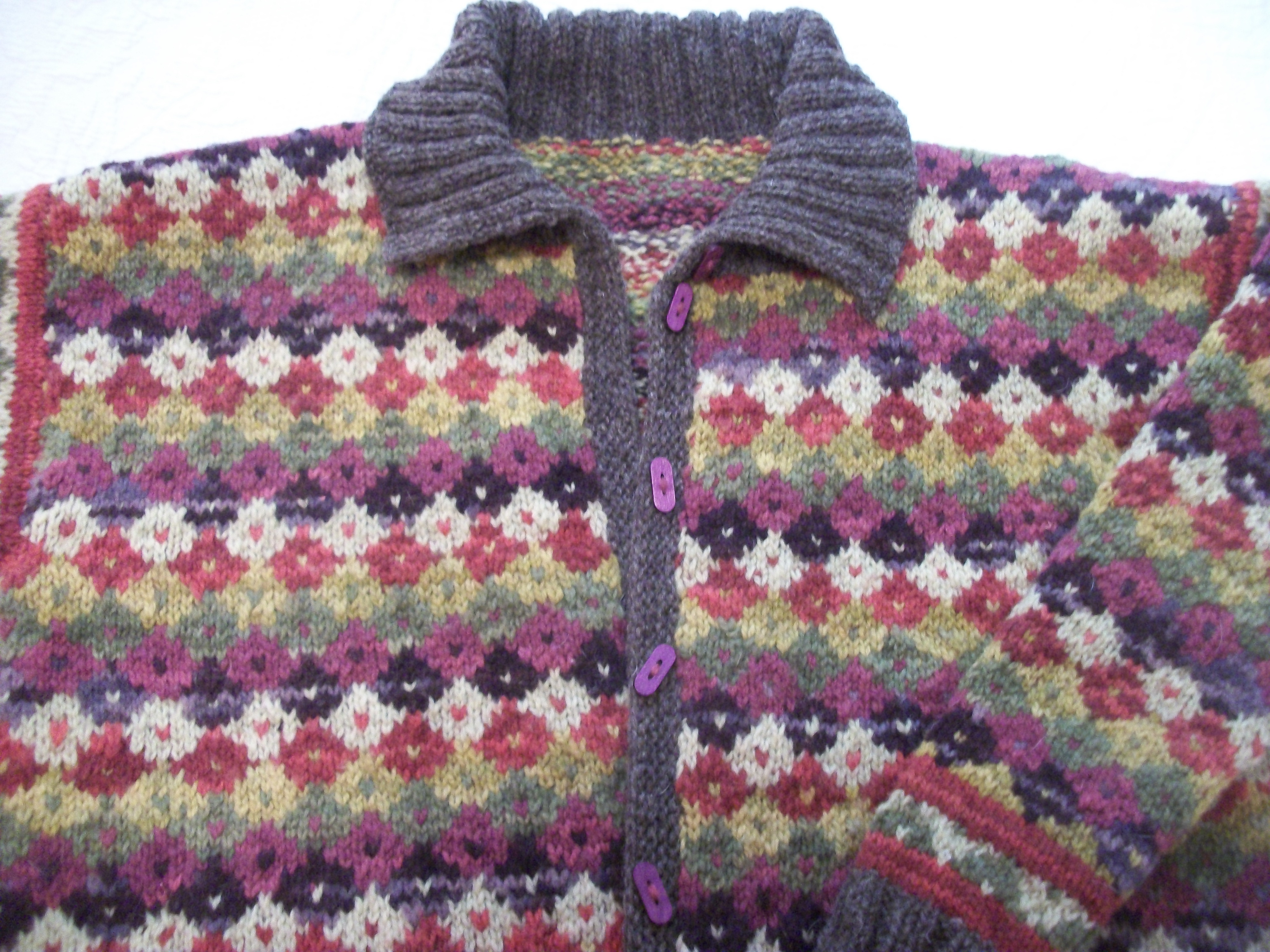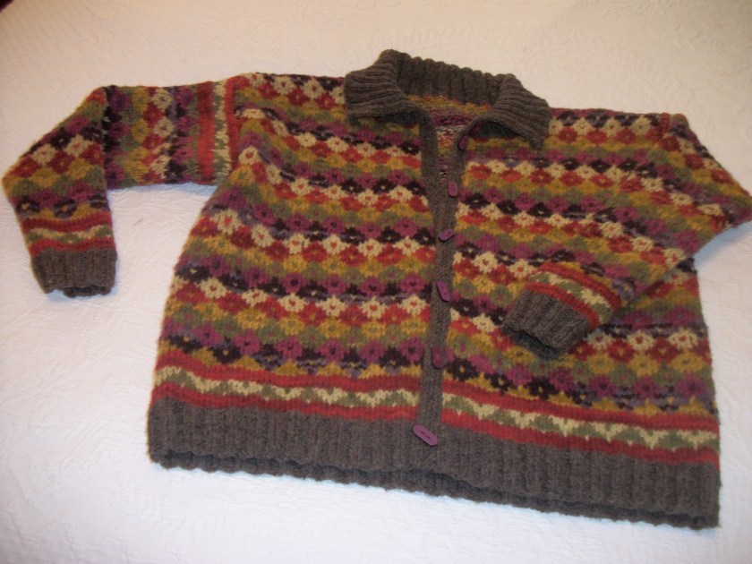 To recap earlier entries on this sweater (click on knitting on the right sidebar or search for Romney Ridge Farm), I met Kelly Corbett of Romney Ridge Farm and Aloisia Pollack at the Maine Organic Farmers and Growers Association “Common Ground” Fair last fall.  Aloisia had made a sweater out of Kelly’s beautiful yarns, and I was instantly captivated.   Aloisia taught me and Giovanna McCarthy how to do the pattern and showed me how to make a cardigan from the pullover pattern.  I added the big collar, as I thought the sweater needed to be really grounded what with all that pattern and color.  And, Helen of Heavenly Socks in Belfast suggested these buttons, which I also really like and would not have found on my own.