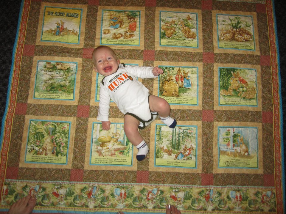 Meyer Kelly on his quilt. I love nothing better than to see a quilt I’ve made being used and loved: