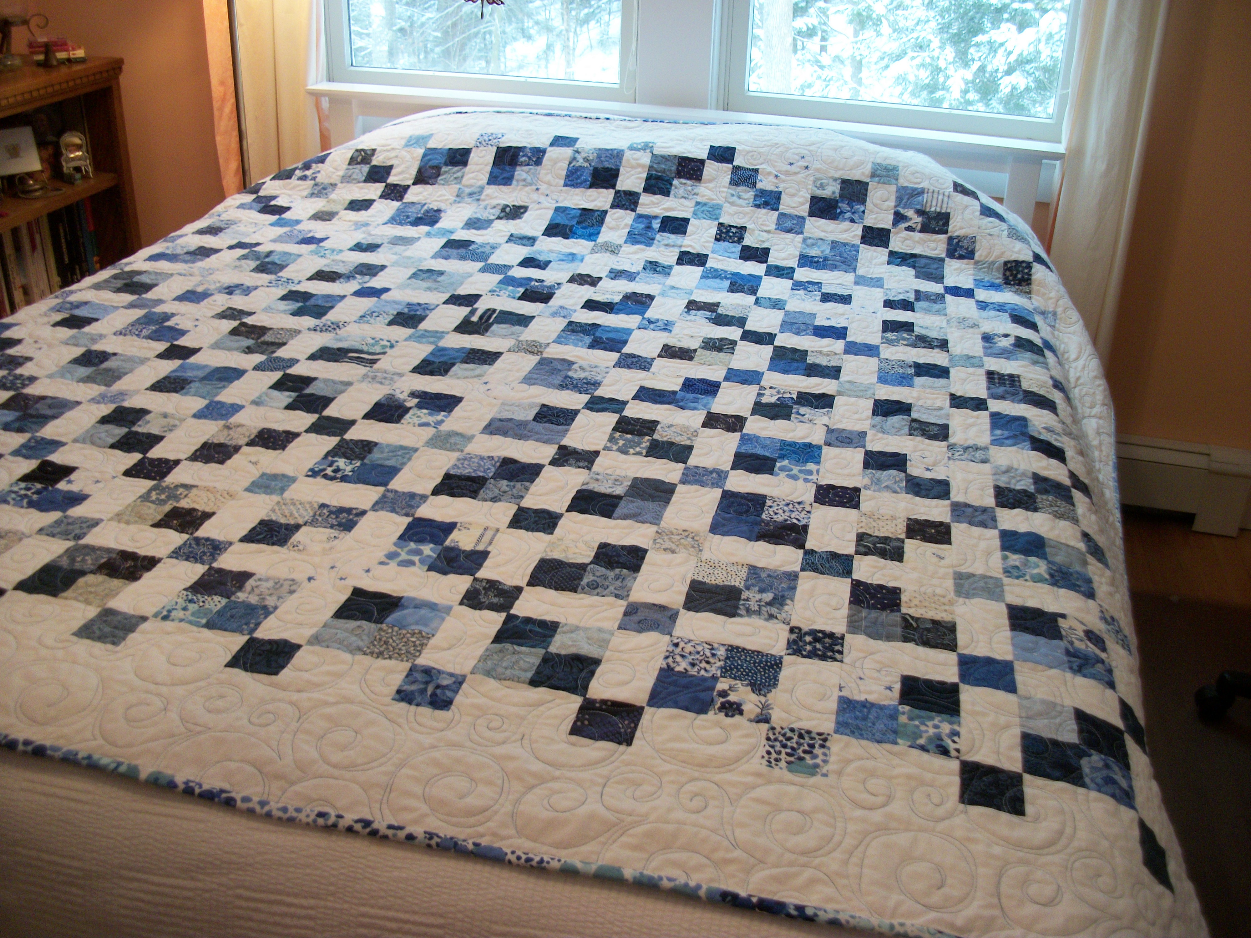 The pattern idea, “Blue Lagoon,” was seen in JELLY ROLL QUILTS by Pam and Nicky Lintott.  I pretty much used the same colors they did—and found a similar quilting pattern.  However, this pattern is pretty basic and could lend itself to many variants.  I’m going to try more blue squares in a low-impact variant.  I found a big floral I’ll use as the white is used in this quilt.  I can hardly wait!!!