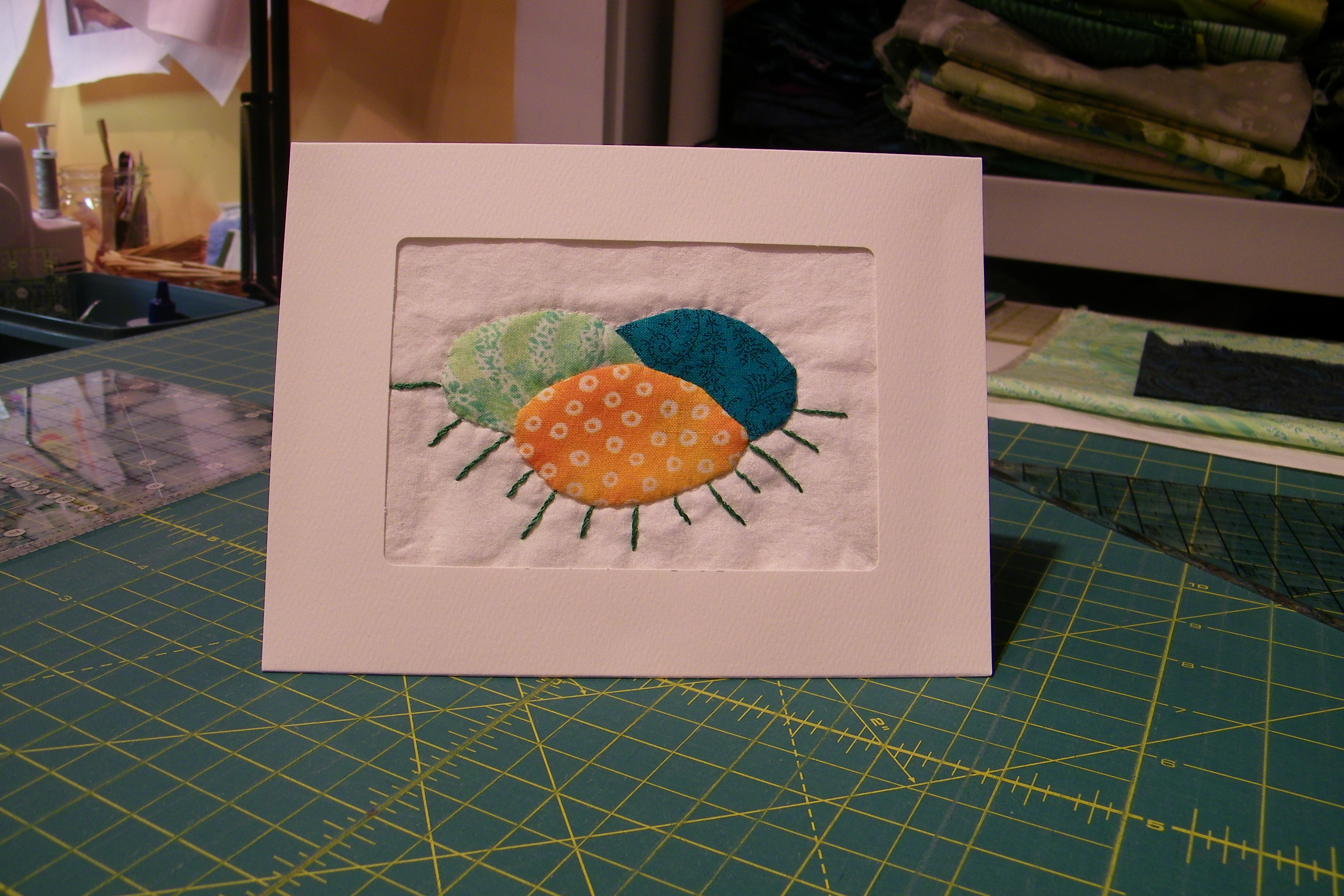 I am working on an applique quilt made with big blocks of green turtles.  I have not done any applique in some time and am very slow at it, so I refreshed my skills (ha! that’s a joke) with this little Easter Card for Maryann–in a class at Coastal Quilters taught by Barb Melchiskey, who is a master appliquer.  If I were doing this card again, I’d chose either a colored card or a colored background.  The two whites aren’t working so well together, and I don’t like the lines running away from the eggs.  But the eggs!  Ah, the eggs.  Perfect for this very eggy household.