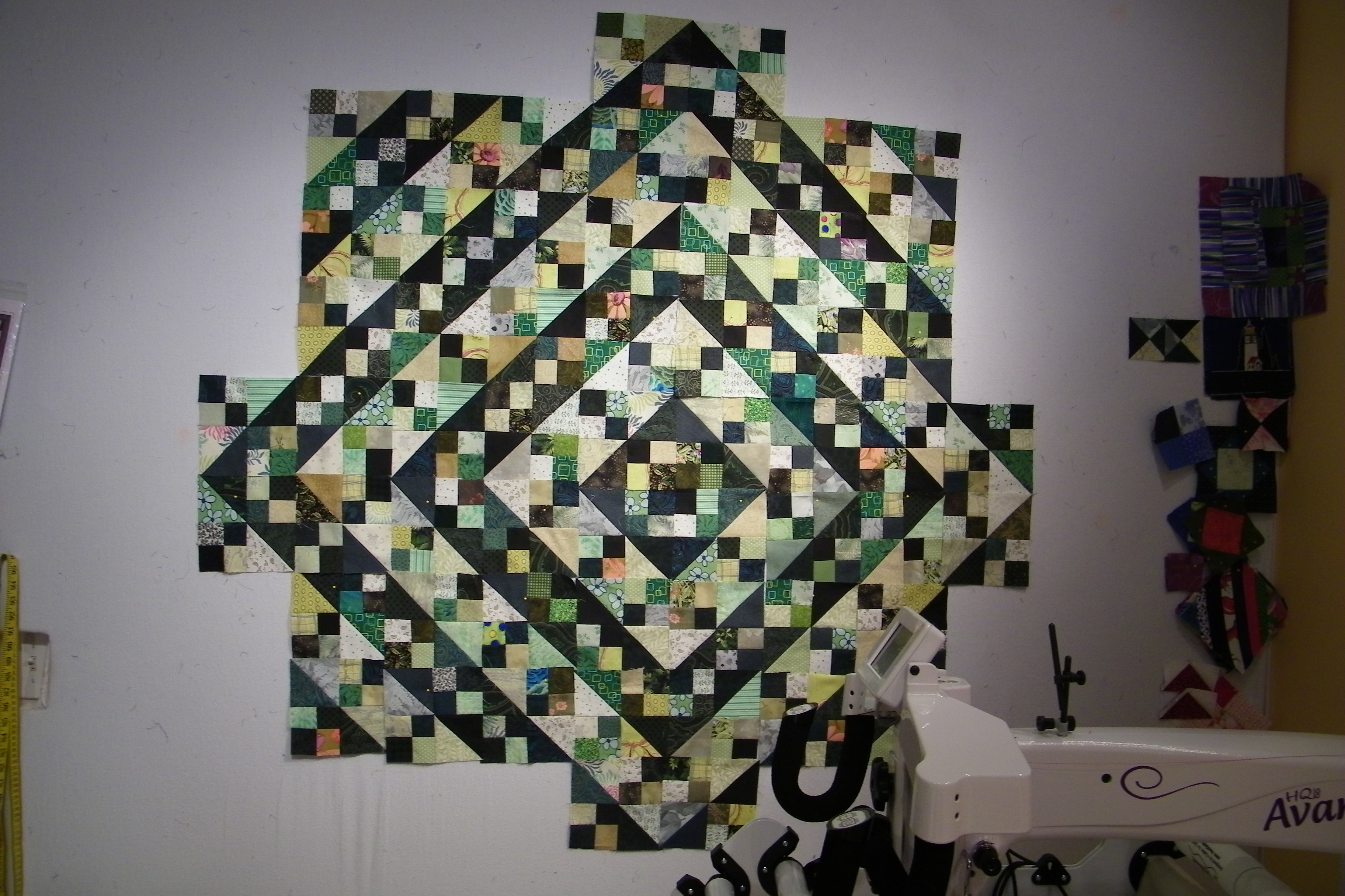 Here’s what happened in short order at my sewing machine–the idea came from Hunter’s LEADERS AND ENDERS.  And it’s putting a real hurt on my green stash fabrics!!!!  I’m no longer just piecing squares  through the machine while working on another project.  I’m making time to make as many blocks as I can.
