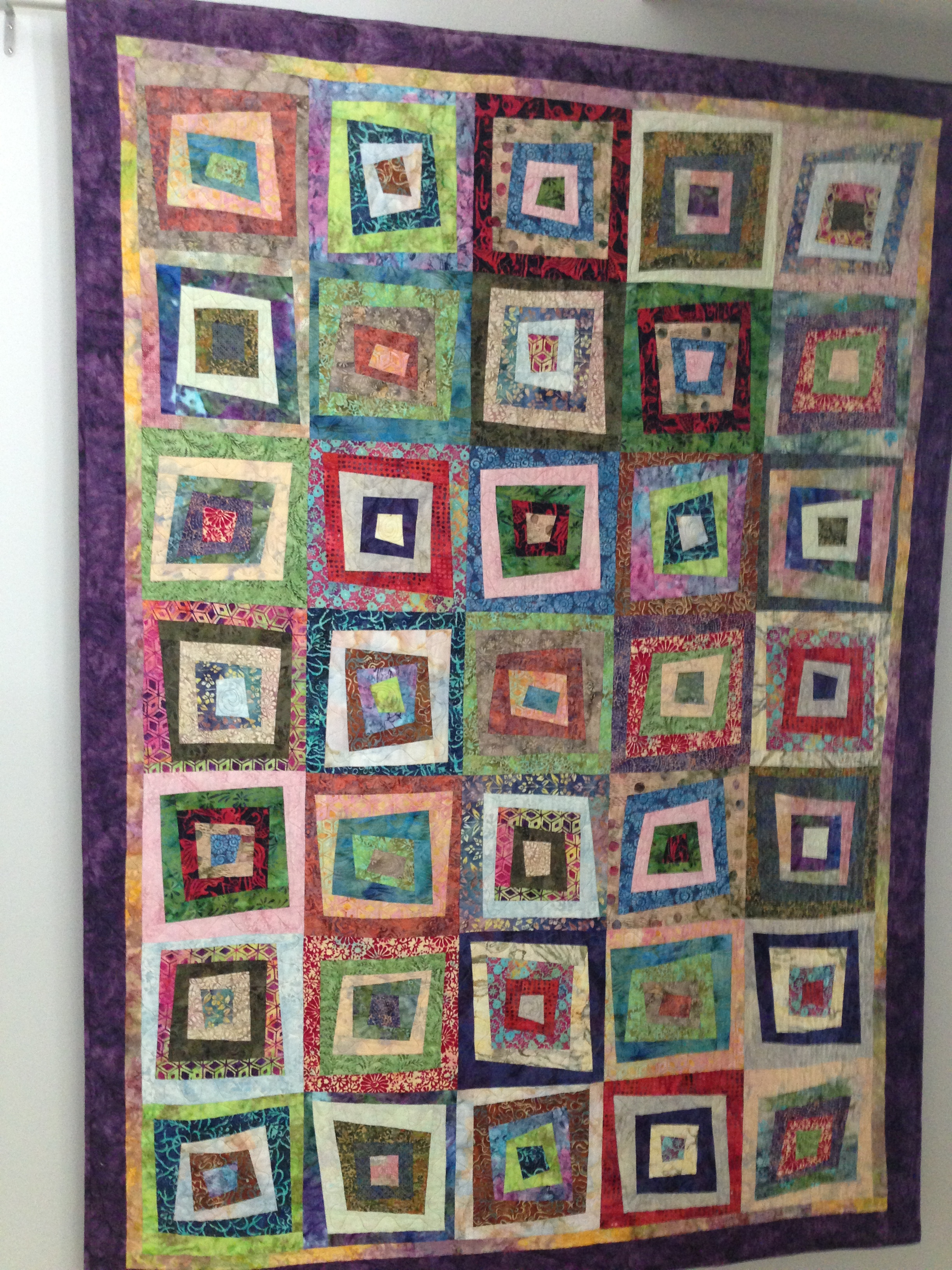 Like me, she loves using squares. This one is all batiks. Isn’t it lovely? It reminds me a bit of the “La La Log Cabin” quilt that Rhea from Alewives Quilting here in Damariscotta Mills taught local quilters to do. There’s one of mine on this blog elsewhere called “Sun, Sea, Sand.”