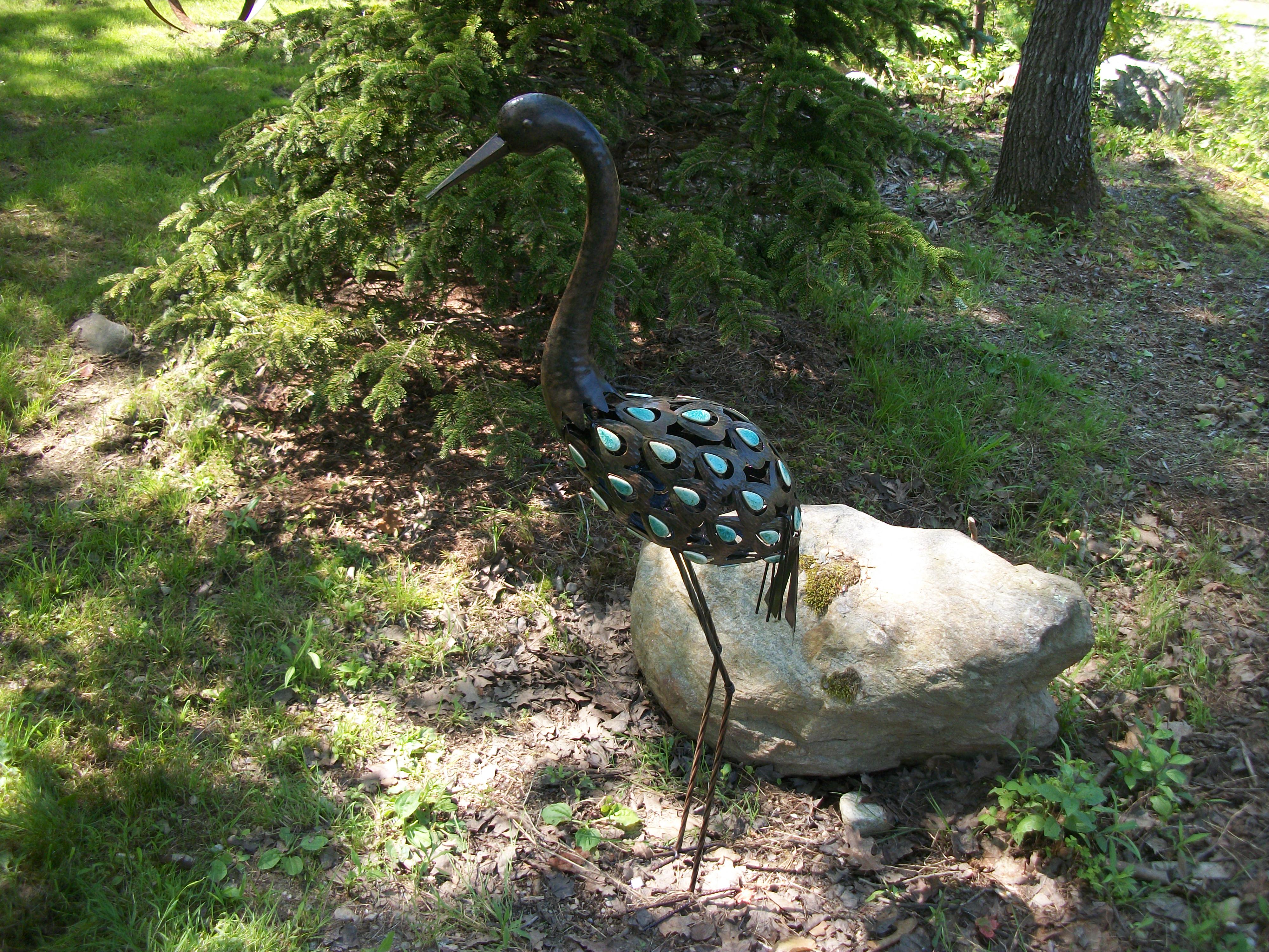 Eileen Ames writes that she and Leonard started the garden in 2000 and spent many hours clearing the land of damaged trees and stumps. There are numerous whimsical and engaging garden fixtures mixed into the nooks and crannies of the garden.