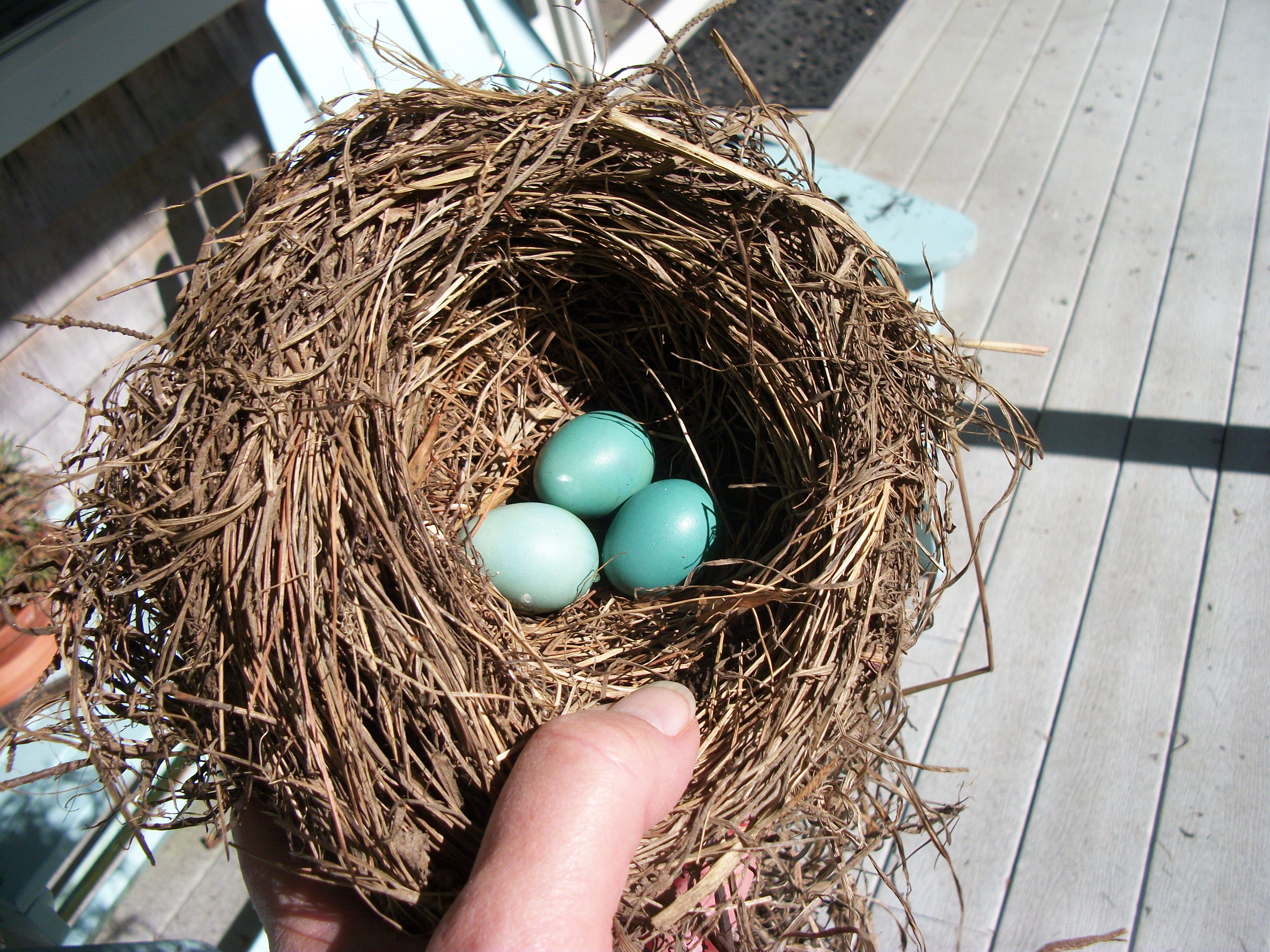 Remember the post on the robin mother that went wild this summer and build 14 nests across the front porch–then settled on two good ones and raised three babies in one?  When I went up on a ladder to clean out the nests for the winter, here’s what I found: