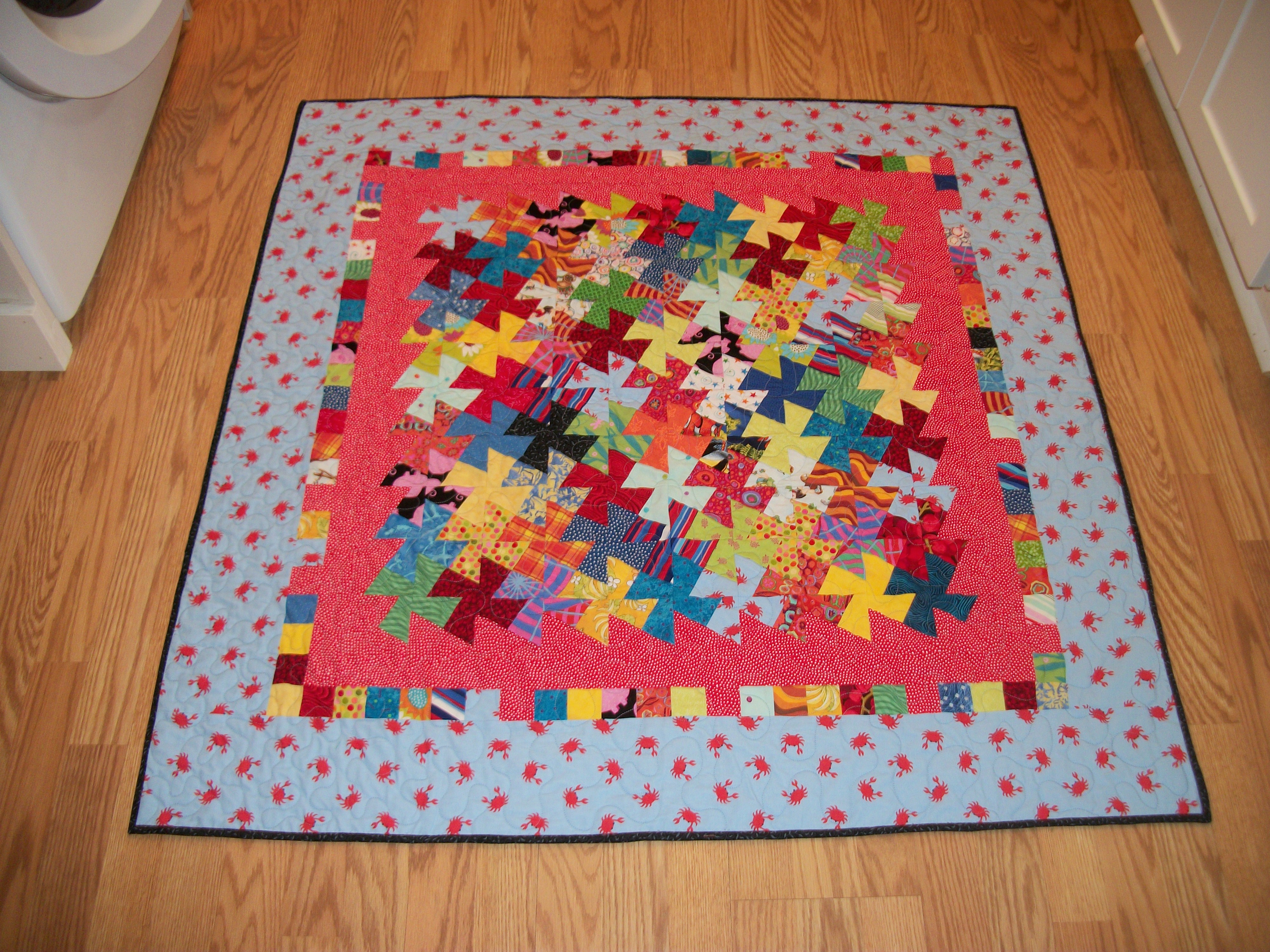 I made “Mister’s Twister” for the boy twin using a “Lil’ Twister” ruler brought home from the Mid-Atlantic Quilt Show in Norfolk, Virginia, I attended last March.