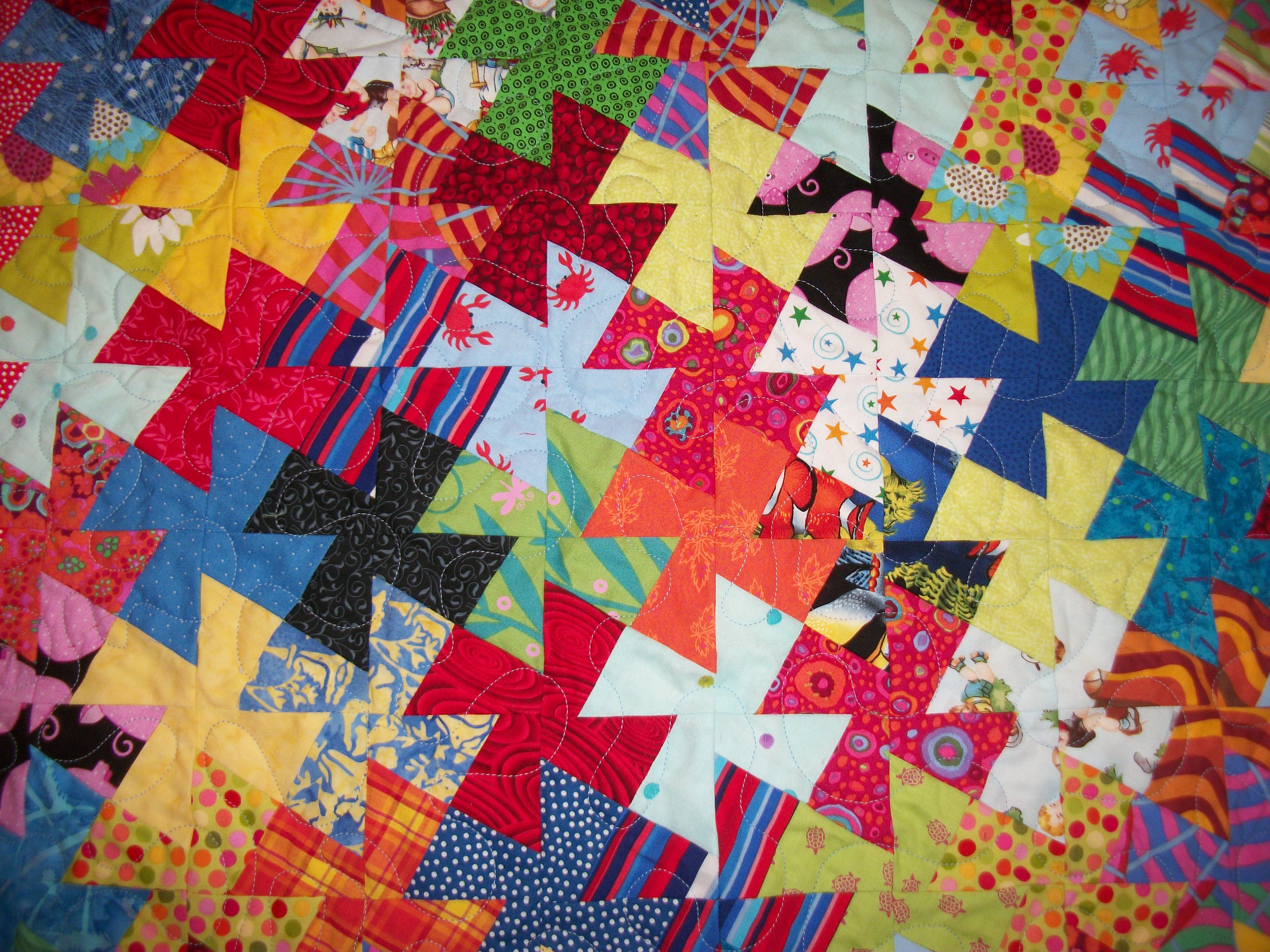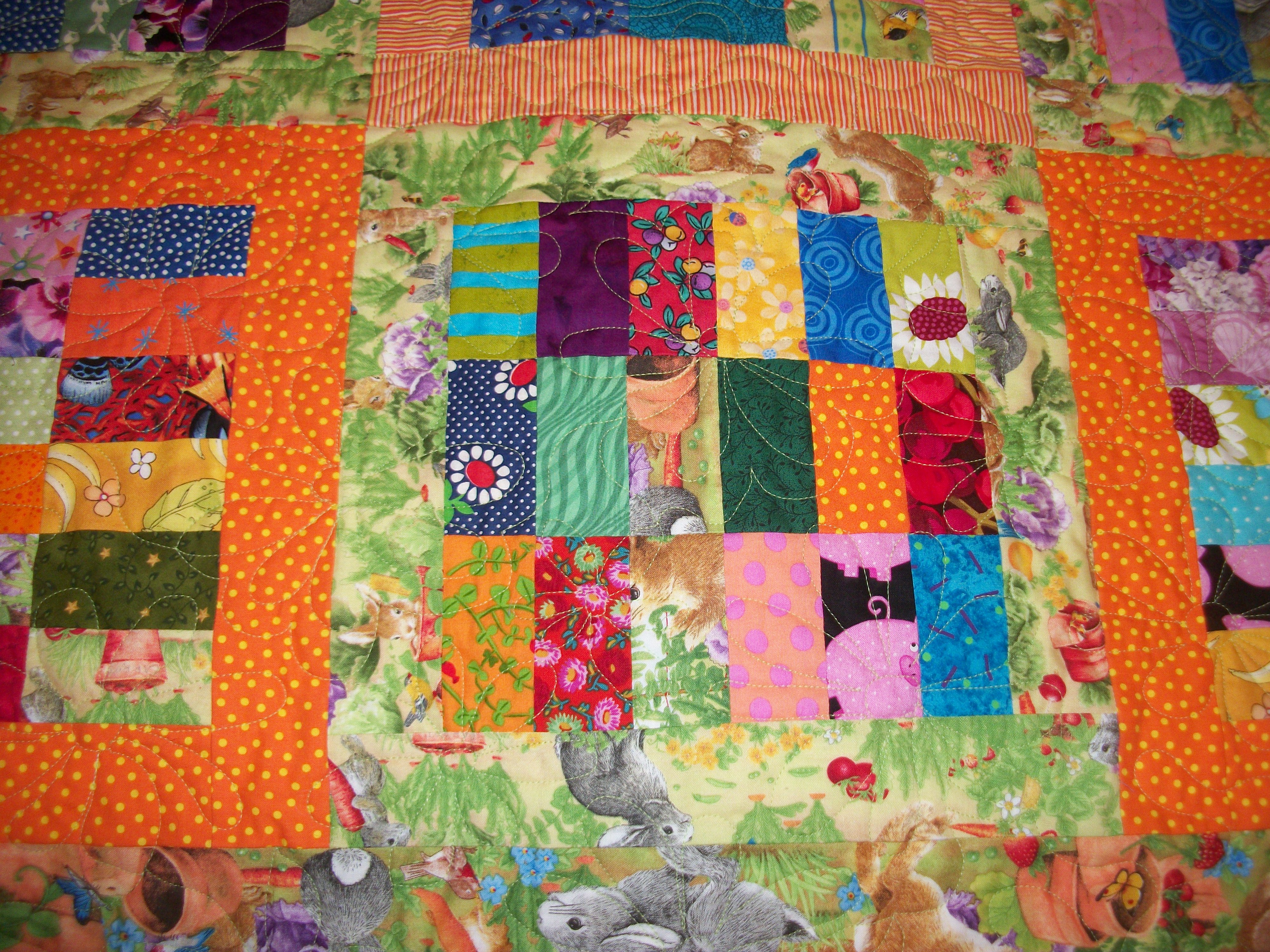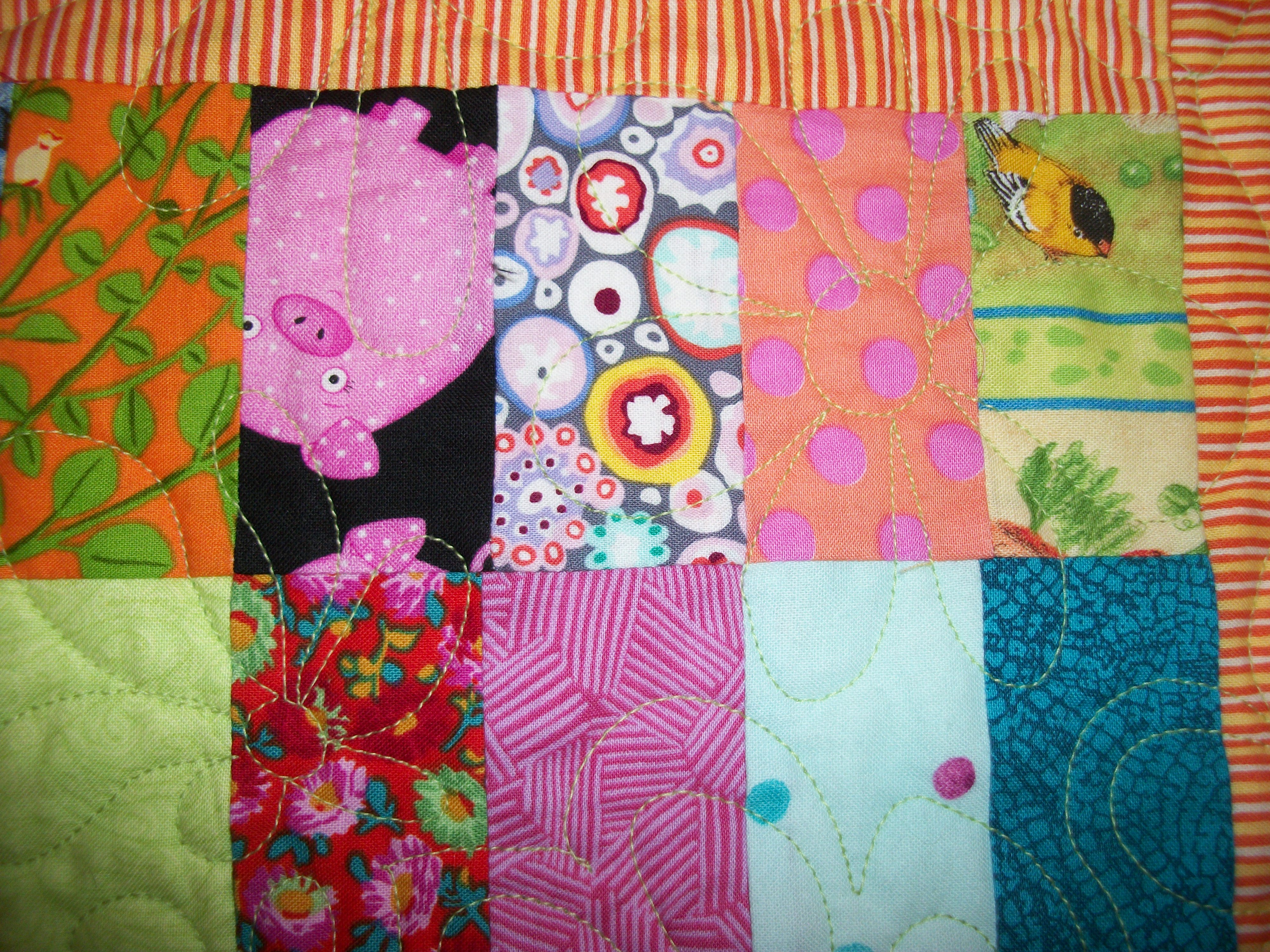 AND, both of these quilts are made from what is now a “deep” stash of fabrics–so each has many pieces of fabric that have gone into other family quilts–which forms a lovely linkage I think. So, those of you who have been recipients of one of my quilts, look to see if some of your fabric has been used in these two baby quilts.