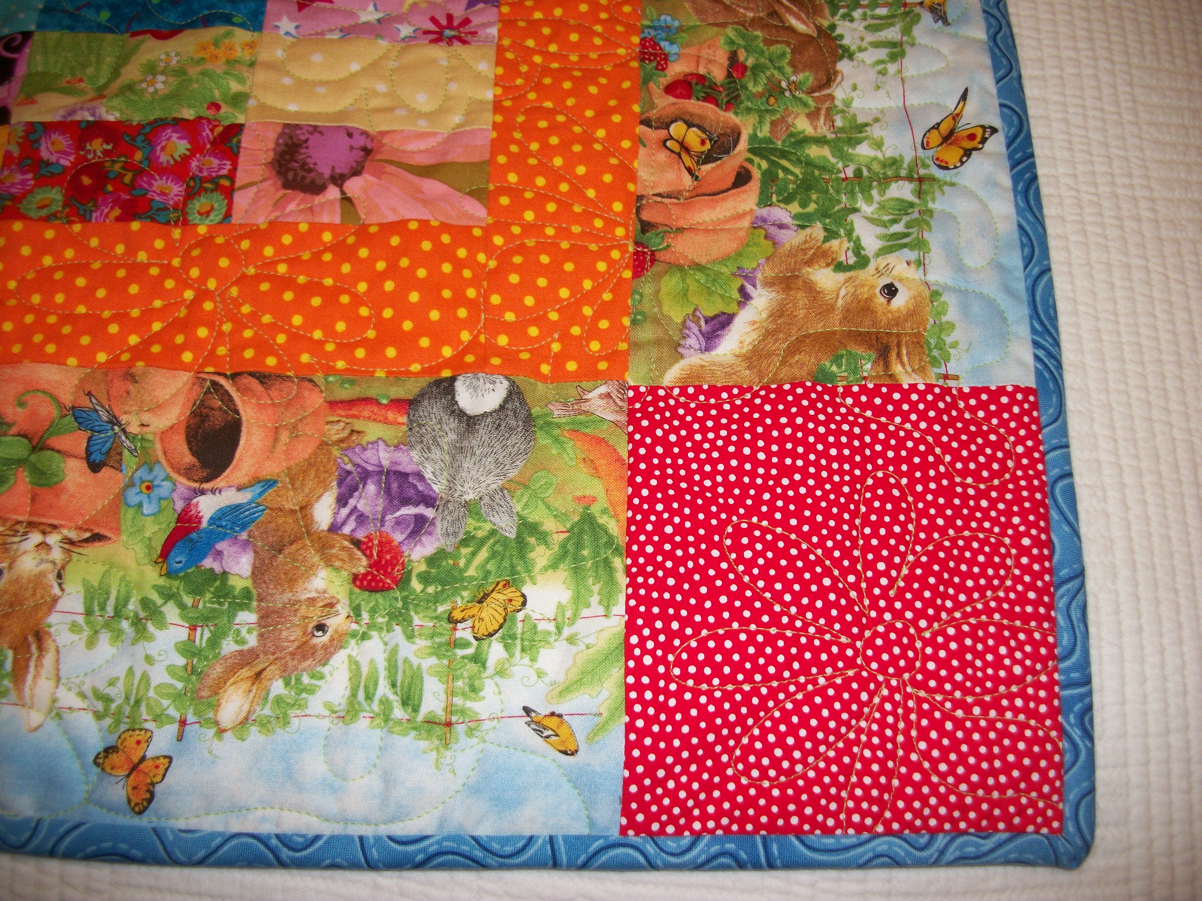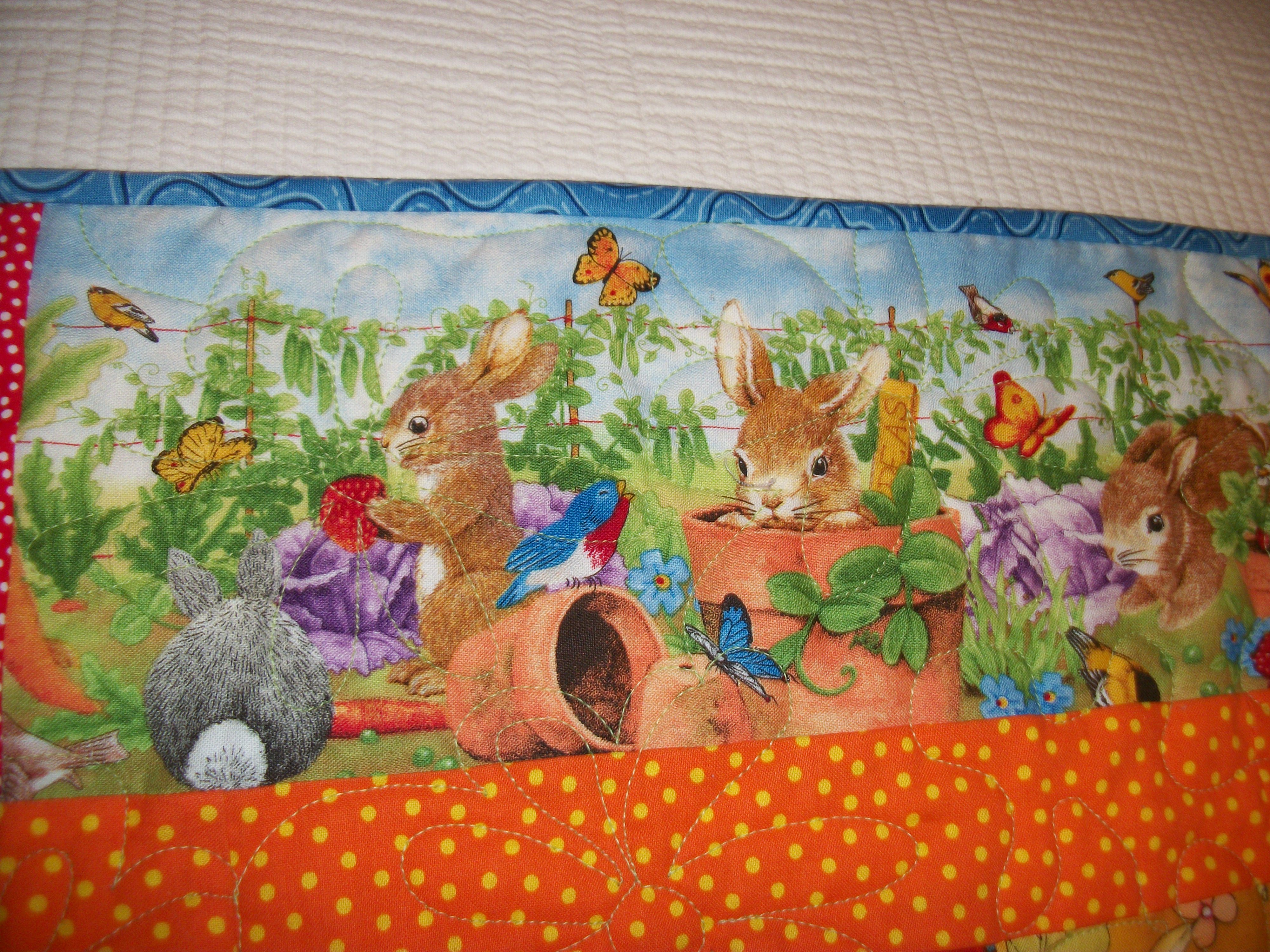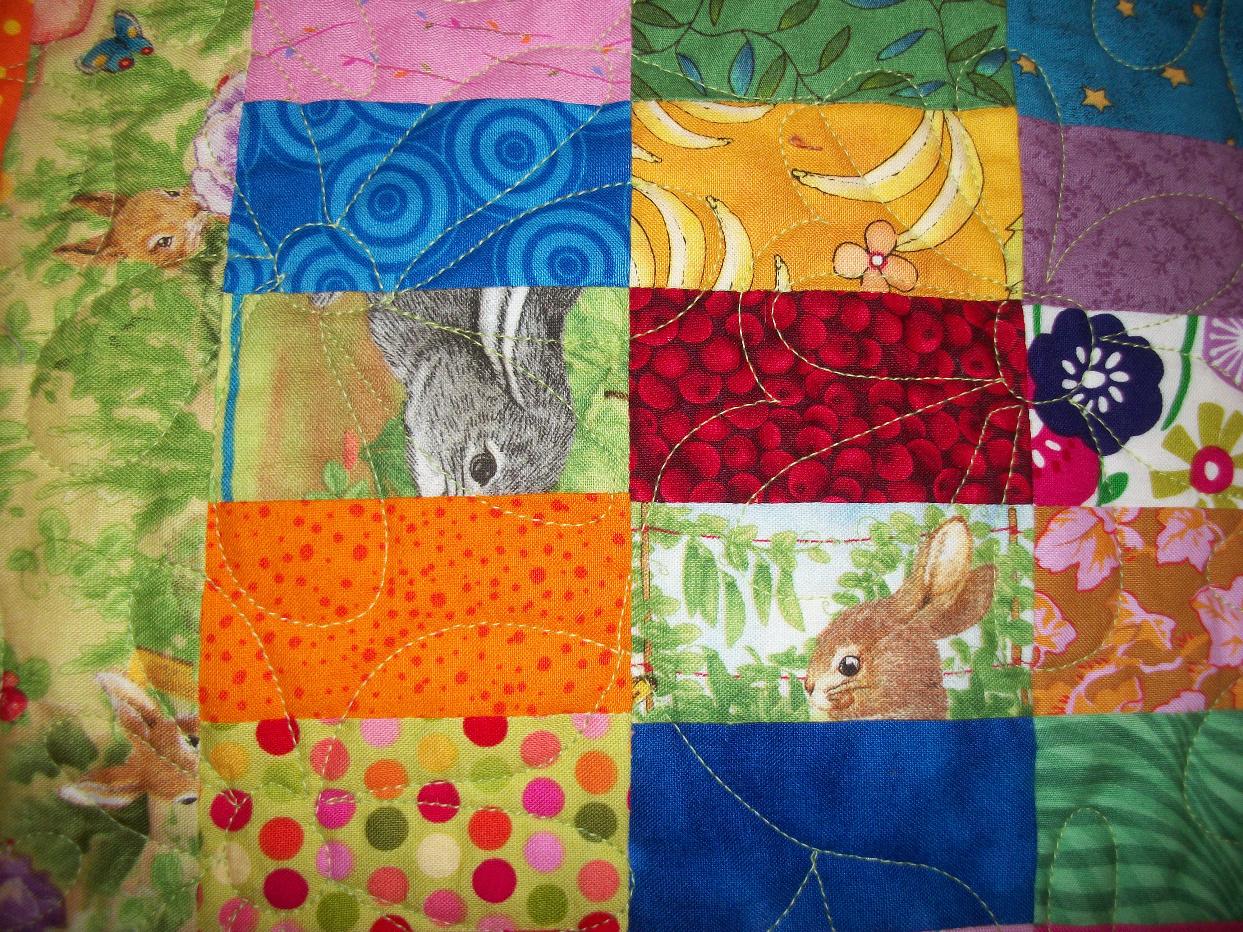 I mixed in squares that had critters other than the focus fabric with its bunnies–along with more bunnies: