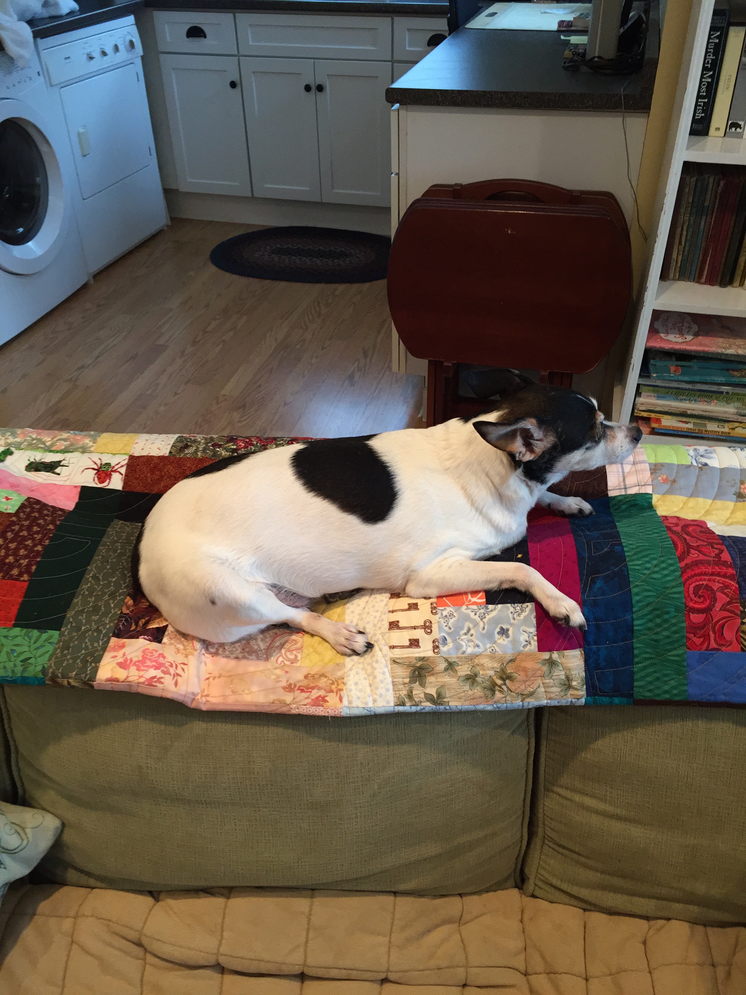 Here it is on the back of the couch. Reynolds Georgia hangs out here a lot. See how ratty the dog blanket looks?