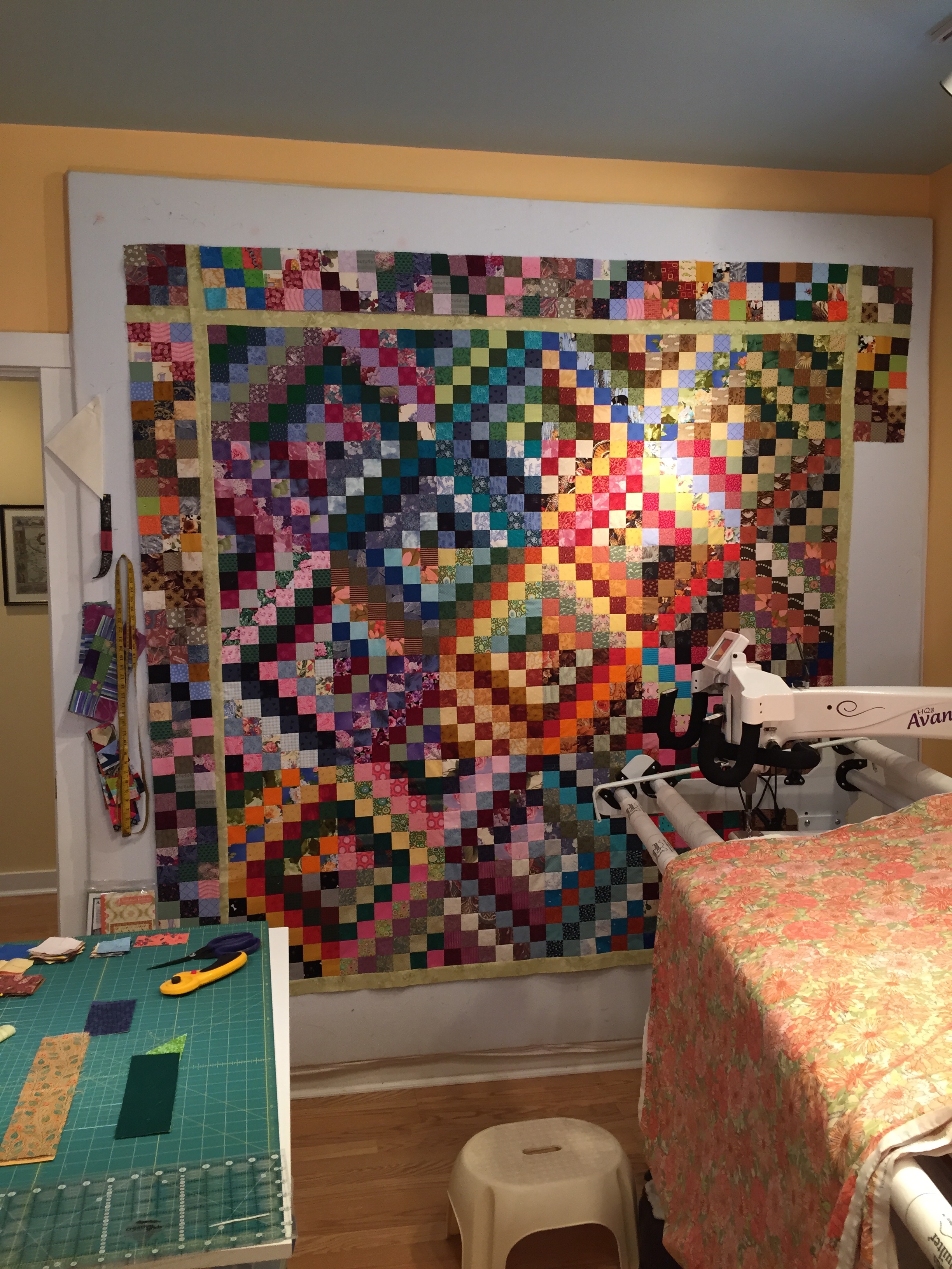 And, here’s the third quilt in this project–almost ready to come off the design wall. I love how this quilt is coming out. This is a Bonnie Hunter pattern, and the border idea is also on her blog: “Scrappy Trip Around the World.” Again, I’m using the 2 1/2=inch scrap strips to build this quilt.