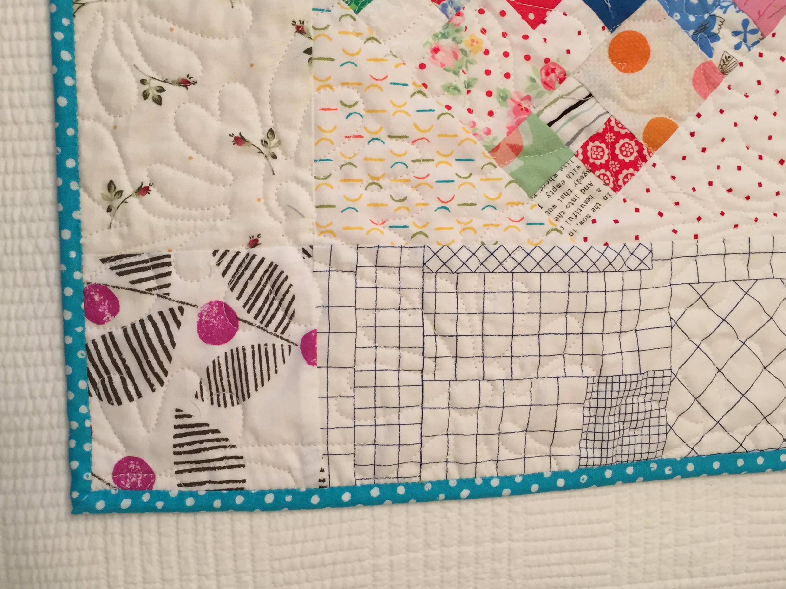 I used Anne Bright’s 10″ “He Loves Me” pantograph with a cream-colored thread. The quilting is lovely if I do say so myself!